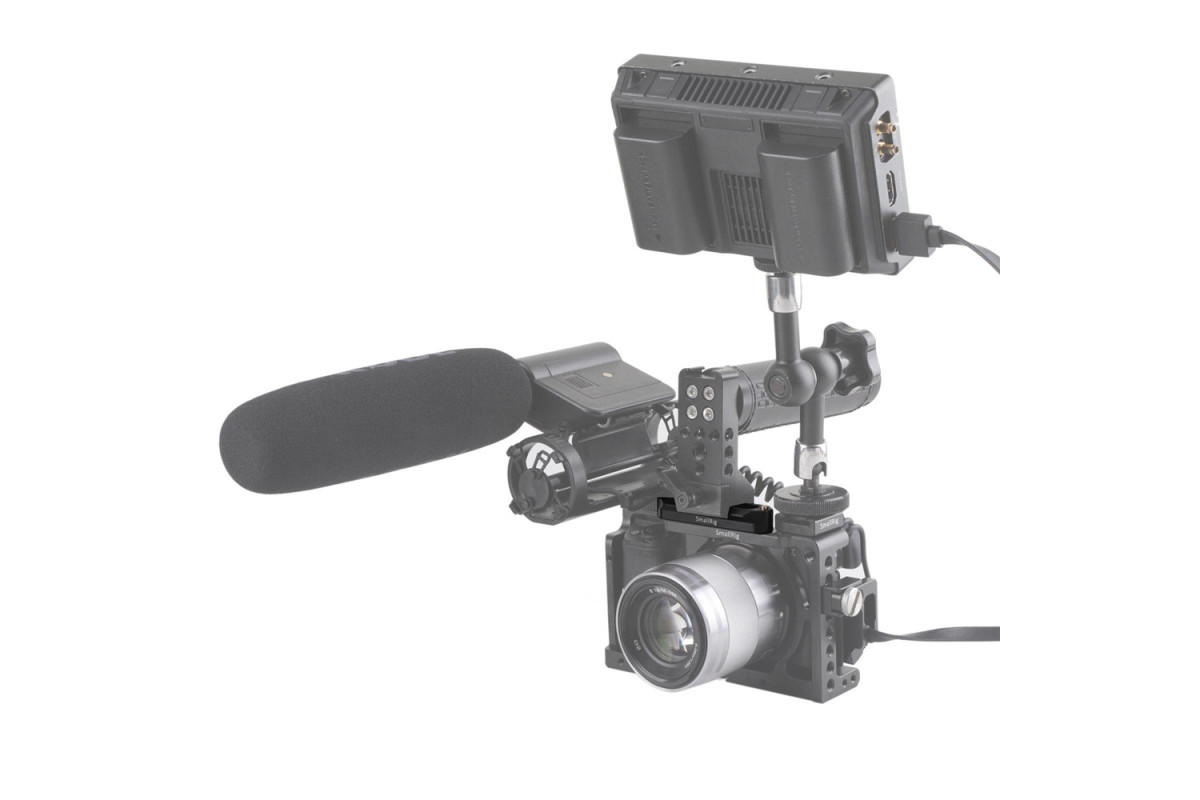 Адаптер имеет длинный NATO-рейл с отверстиями для крепления различных аксессуаров, таких как микрофоны, световые панели, ручки, грипсы и другое оборудование.