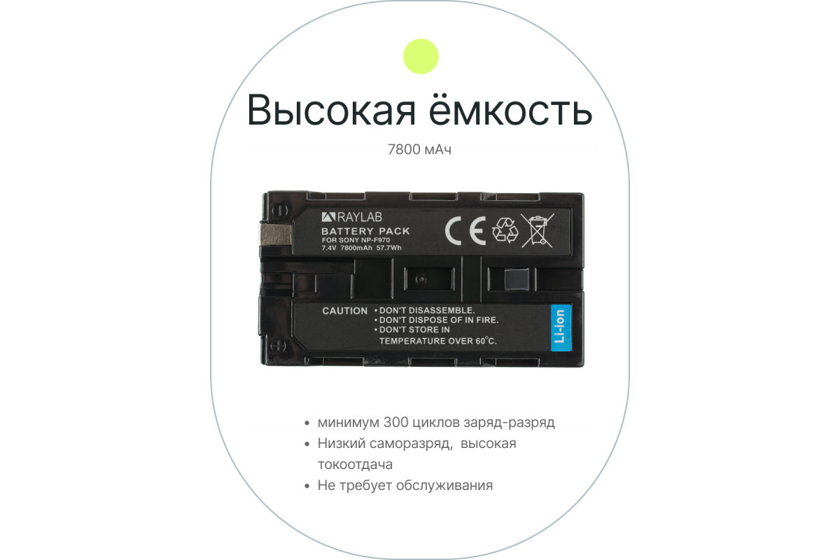 Аккумулятор литий-ионный 7800мАч, аналог Sony NP-F970. Надёжный качественный аккумулятор с низким уровнем саморазряда, защитой от перезаряда, глубокого разряда или короткого замыкания благодаря встренному контроллеру. Совместим с камкордерами Sony, а также подходит для использования со светодиодными осветительными приборами и накамерными мониторами.