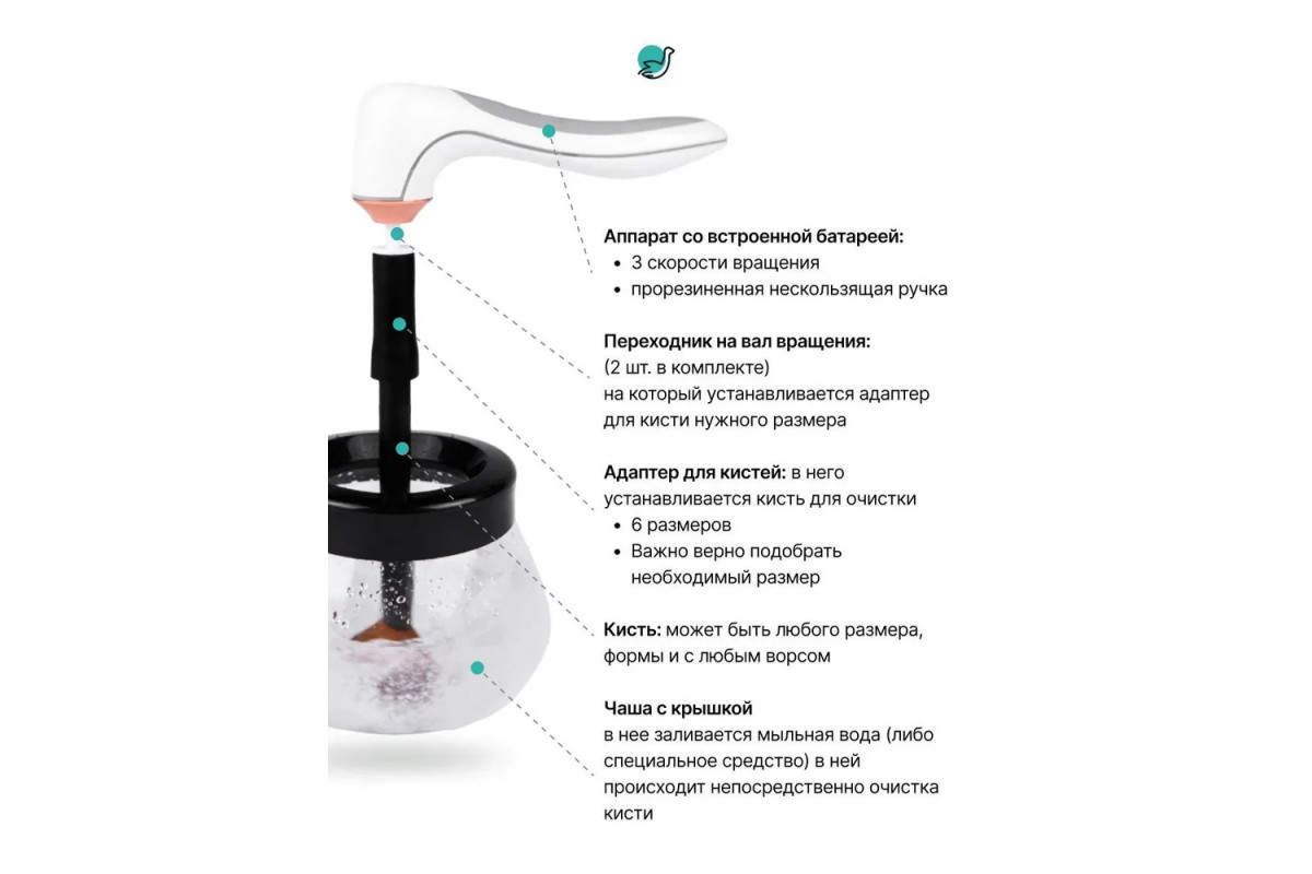 В комплекте вы найдете детальную инструкцию по эксплуатации на русском языке, 6 переходников на кисти разного размера, подставку и сам гаджет с тремя скоростными режимами, удобным управлением и стильным внешним видом. Кисти будут чистыми, а ваш макияж безупречным! Попробовав автоматический очиститель раз, вы уже не захотите возвращаться к прежним способам мойки кисточек. Создавайте красоту вместе с CleverCare и помните о том, что вы прекрасны!