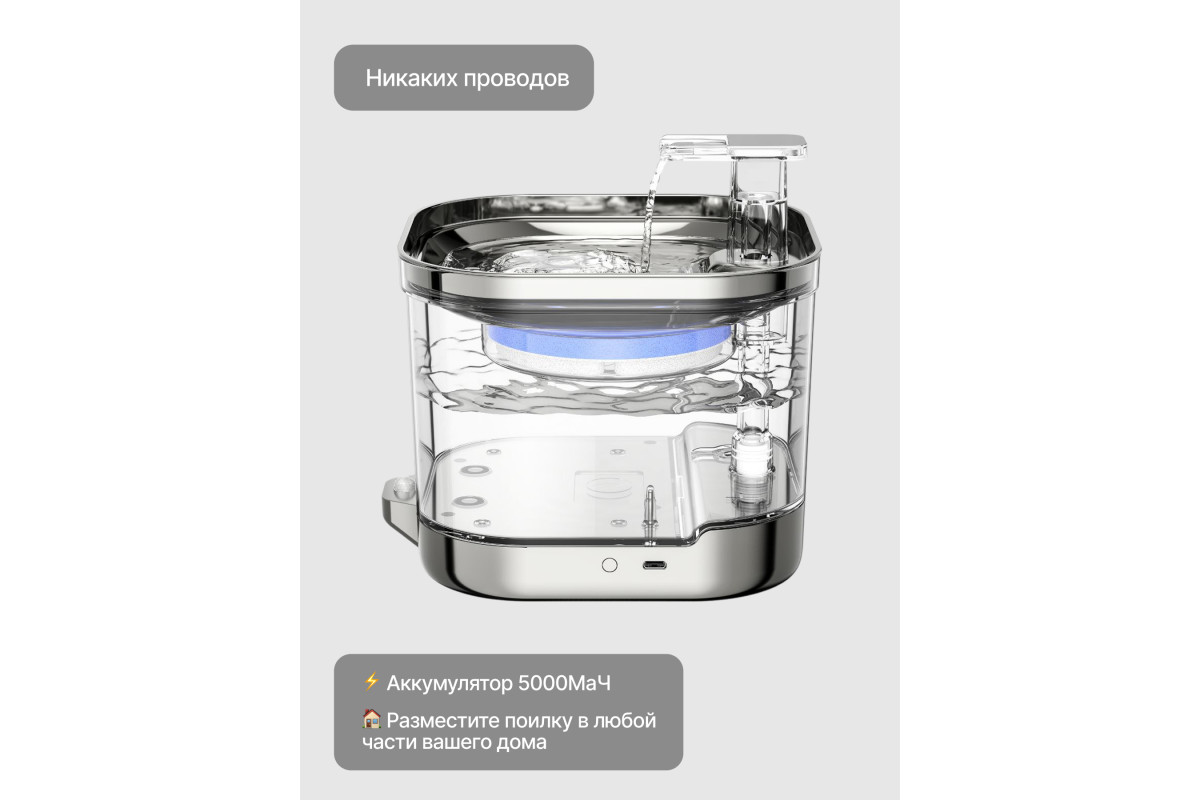 Беспроводная поилка, благодаря аккумулятору 5000 mAh, может работать на одном заряде до 60 дней.