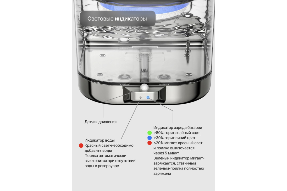 Автопоилка обладает современным датчиком движения с радиусом действия до 1,5 метров и углом обнаружения 270 градусов. Когда питомец покидает зону действия датчика, поилка автоматически останавливается спустя 30 секунд.
