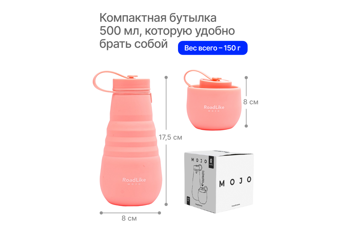 Складная бутылка RoadLike MOJO поможет не только брать любимые напитки с собой, но и сократить использование одноразовых пластиковых бутылок. Корпус бутылки изготовлен из пищевого силикона, который легко моется в посудомоечной машине или под проточной водой. Надежная крышка с уплотнителем на 100% защитит от протекания. В сложенном виде бутылка настолько компактна, что поместится даже в миниатюрную сумочку или карман.