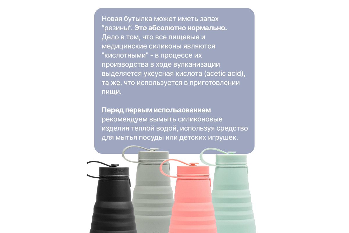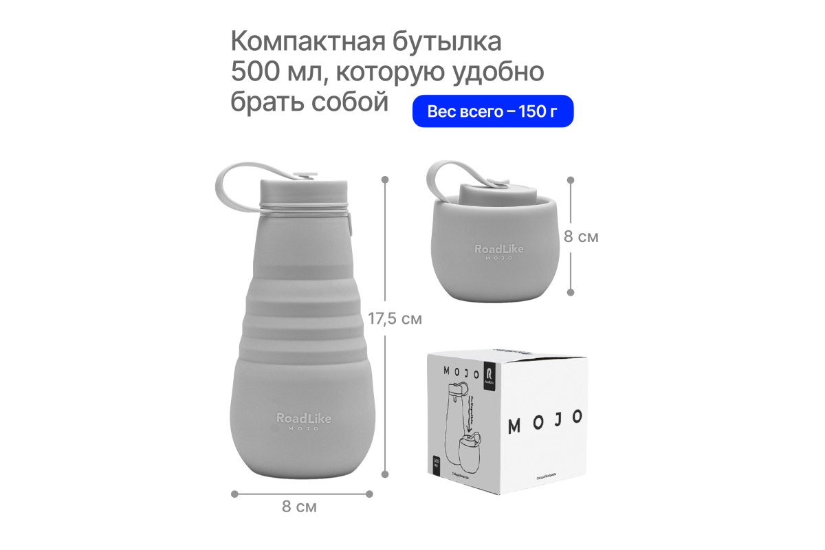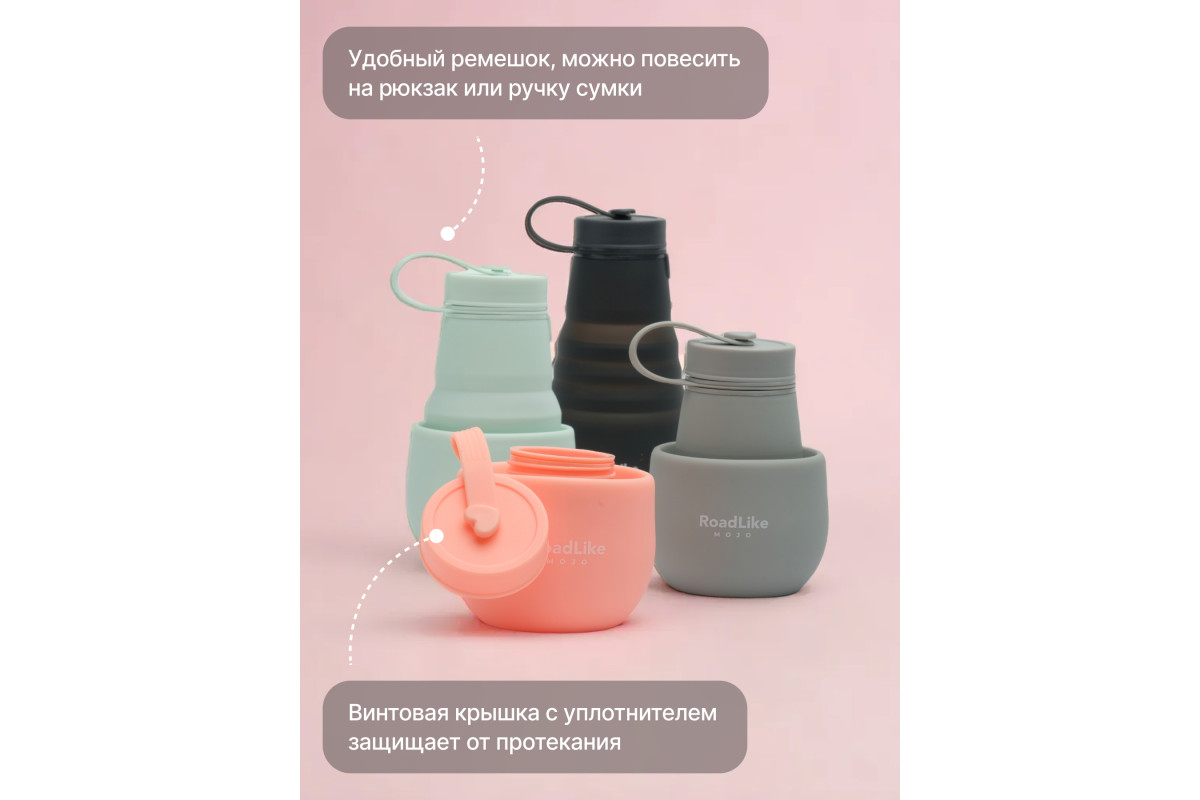 Складная бутылка RoadLike MOJO поможет не только брать любимые напитки с собой, но и сократить использование одноразовых пластиковых бутылок. Корпус бутылки изготовлен из пищевого силикона, который легко моется в посудомоечной машине или под проточной водой. Надежная крышка с уплотнителем на 100% защитит от протекания. В сложенном виде бутылка настолько компактна, что поместится даже в миниатюрную сумочку или карман.