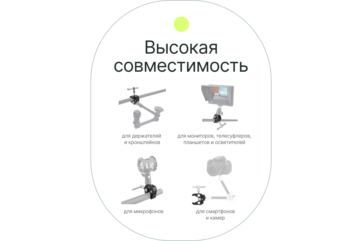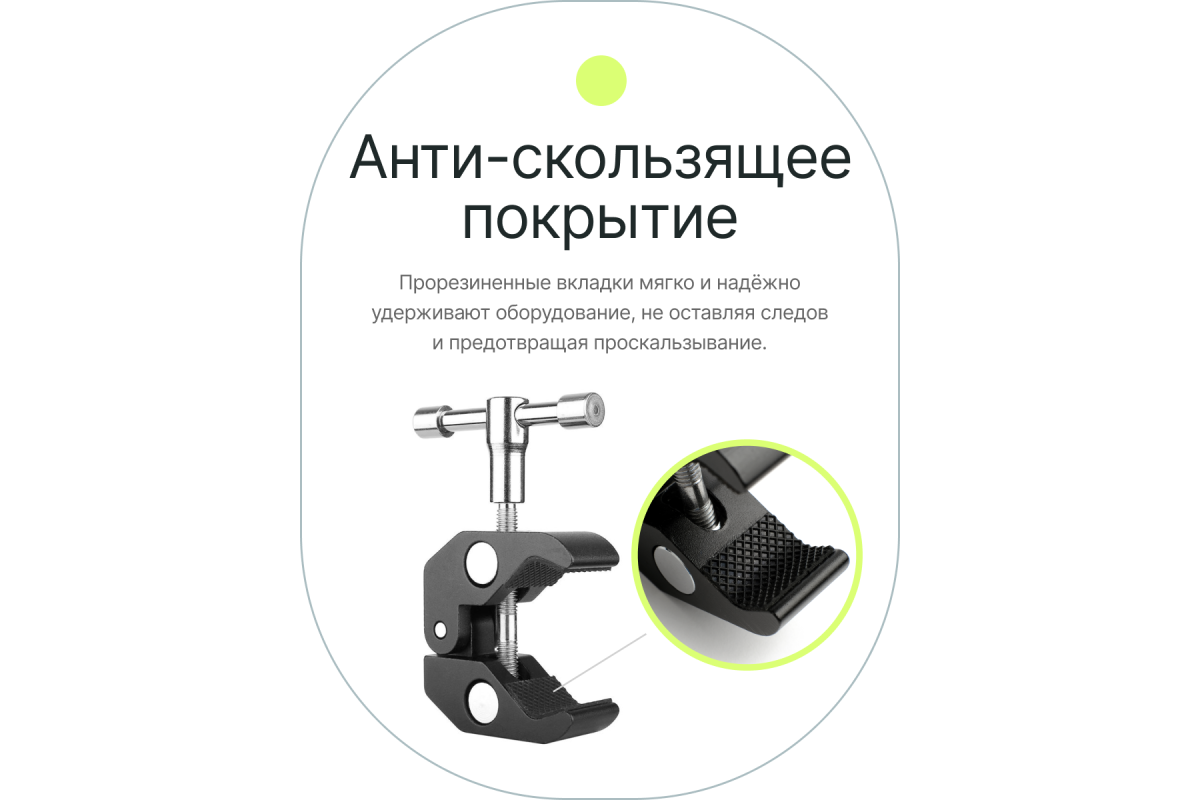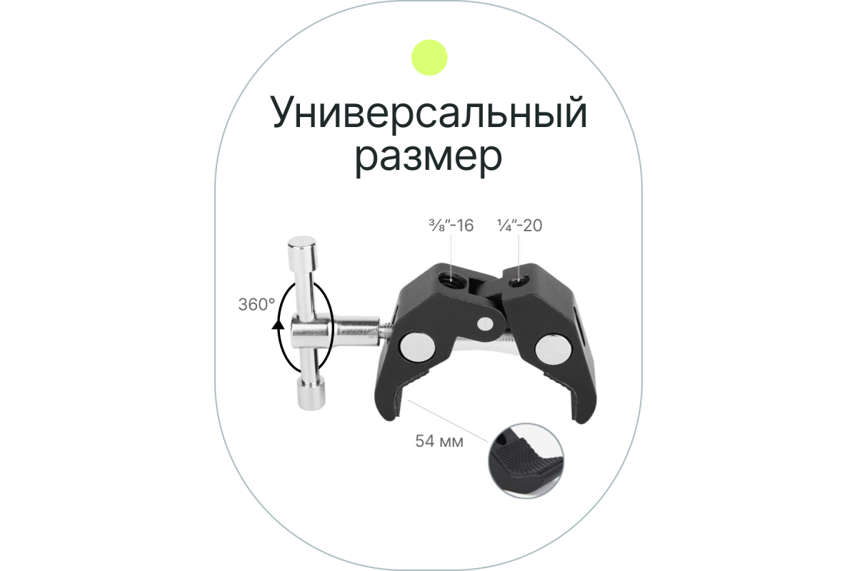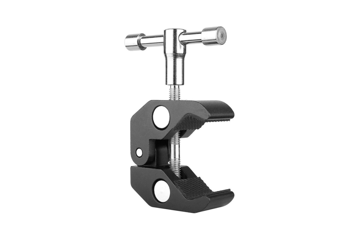 В конструкции предусмотрены два резьбовых отверстия диаметром 1/4" и 3/8", благодаря этому зажим является универсальным для использования практически с любым устройством, например осветительным прибором, монитором или микрофоном.