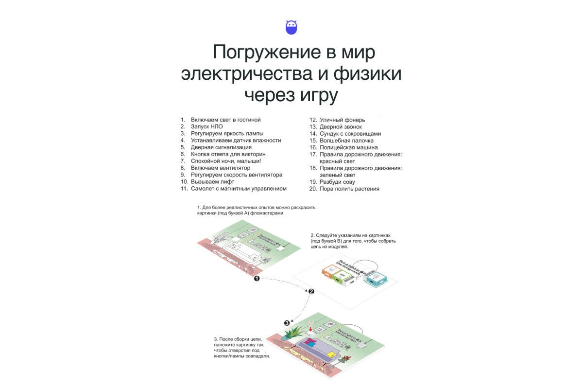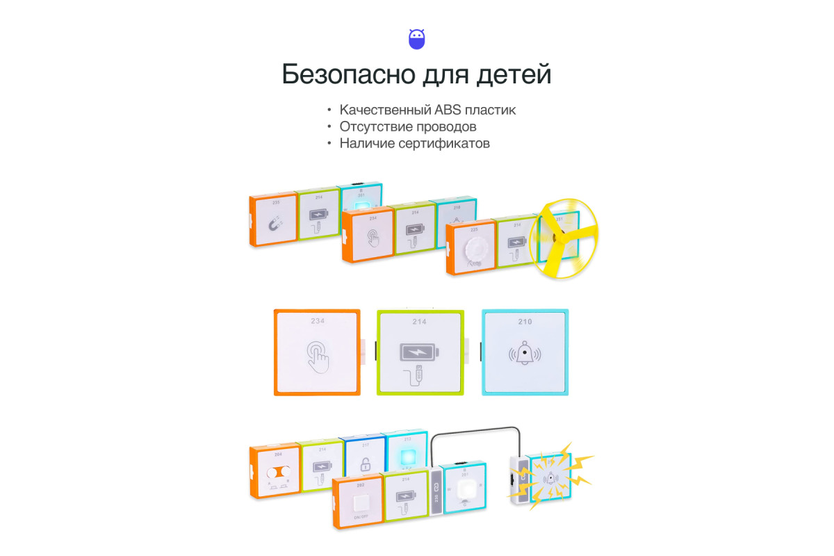 Конструктор изготовлен из качественного пластика ABS и сертифицирован на соответствие стандартам безопасности.В комплекте этого большого конструктора содержится 15 модуль блоков, которые легко соединяются между собой без использования проводов. С их помощью можно собрать множество электронных схем. Это открывает бесконечные возможности для детского творчества и экспериментов. Подробная инструкция, включенная в комплект, поможет разобраться с электросхемами и пошагово научит детей основам электроники, от простых конструкций к более сложным. В наборе также предусмотрены ситуативные раскраски (20 шт.), которые интегрированы в сборку схем. С ними ребенок поймет как работает свет в доме, воспроизводится звук на будильнике и многое другое.