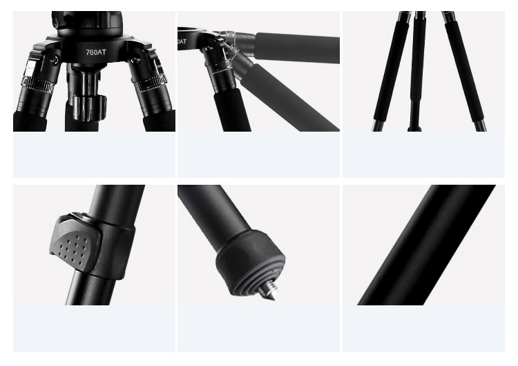 Штатив E-IMAGE 760AT изготовлен из алюминия и оснащён 3-секционными ножками с отдельными фиксаторами для каждой ножки. Фиксаторы ножек просты в использовании для быстрой регулировки высоты, а ножки могут быть независимо установлены под разными углами, что позволяет использовать этот штатив для съёмки в различных условиях. 760AT выдерживает нагрузку до 20 кг, обладает рабочей высотой от 19 до 127,5 см, а также оснащён чашей 75 мм для установки штативной головки для видеосъёмки.