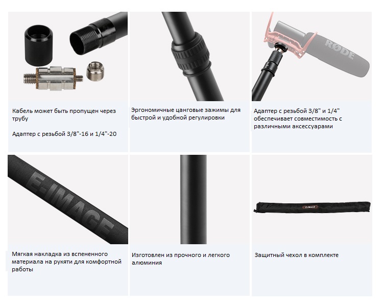 5-х секционная выдвижная штанга, рабочий диапазон 90 - 350 см, с плавными цанговыми зажимами. Совместима с аксессуарами с креплением 1/4"-20 и 3/8"-16. С возможностью внутреннего размещения кабеля.