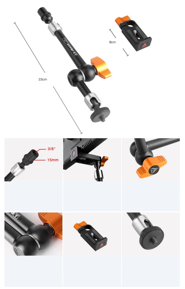 2 резьбовых крепления 1/4"-20M (площадка) и 3/8"-16F (15-мм стержень) на концах кронштейна присоединены к шарнирам, поворачивающимся на 360 градусов, плюс выемка на хомуте, окружающем шар, даёт возможность наклона резьбового крепления на 90 градусов.