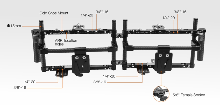 Модульная конструкция регулируется для установки монитора (до 9"), крепления аккумулятора (тип V-Lock) и системы беспроводной передачи данных.
