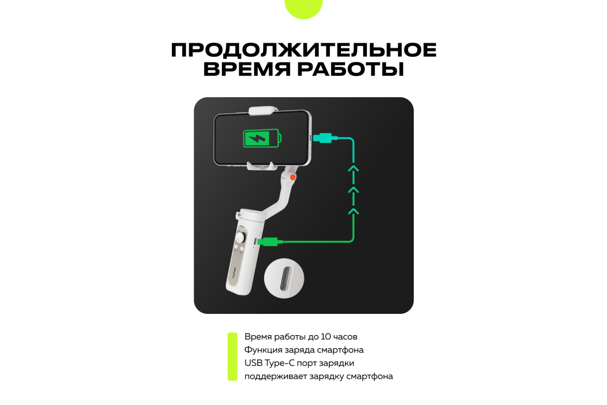 Пусть ваши идеи для творчества не ограничиваются уровнем заряда. В стабилизаторе установлен аккумулятор емкостью 2800 мАч, обеспечивающий до 10 часов автономной работы. Кроме того, устройство можно использовать в режиме павербанка, подпитывая от него разрядившийся смартфон. Заряжается стабилизатор за 2,5 часа от любого источника с интерфейсом USB Type-C достаточной мощности.