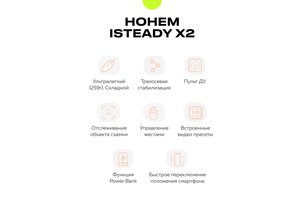 Hohem iSteady X2 – компактный и функциональный 3-осевой стабилизатор для смартфона, который поможет вам снимать плавные и качественные видео. Устройство компенсирует дрожание рук, стабилизируя телефон по осям панорамирования, наклона и крена, а также может отслеживать лица и объекты при установке мобильного приложения Hohem Pro.