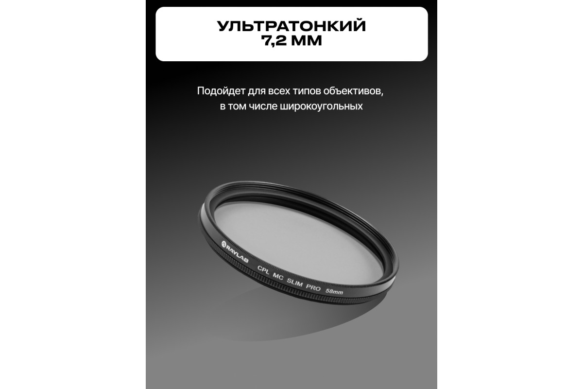 Профессиональный поляризационный светофильтр RayLab CPL MC Slim Pro– универсальный фильтр, который не только обеспечит надёжную защиту линзы вашего объектива, но также подарит контроль над бликами от неметаллических поверхностей. Съёмка рыб под водой или сквозь витрины – с этим фильтром это возможно. Фильтр для камеры имеет множественное просветление, что обеспечивает высокую передачу света и минимизирует отражения и блики, сохраняя при этом естественные цвета и контрастность. Тип фильтра - циркулярный поляризационный, что позволяет вам легко регулировать степень поляризации, просто поворачивая фильтр в оправе. Это очень удобно и позволяет вам быстро настроиться на различные условия съемки. Этот светофильтр для фотоаппарата имеет толщину оправы с резьбой всего 7,2 мм, что позволяет его использовать со всеми типами объективов, в том числе широкоугольными. Инновационное оптическое стекло, используемое в поляризационном фильтру cpl, гарантирует высокую оптическую производительность и минимальные искажения изображения. Вы сможете получить четкие и резкие фотографии с повышенной глубиной и насыщенностью цветов. Фильтр компактно упакован в размере 11 х 13,5 х 2 см и имеет небольшой вес 0,080 кг, что делает его удобным в транспортировке и хранении. Вы сможете брать его с собой в любые поездки и съёмки. Мы уверены в качестве нашего продукта, поэтому предоставляем гарантию производителя на 6 месяцев. Вы можете быть уверены, что ваш этот фильтр для объектива будет служить вам долгое время и обеспечит превосходными результатами.