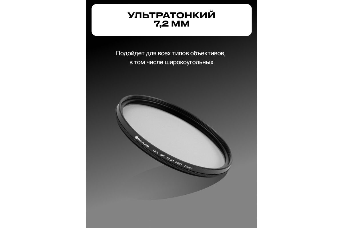 Профессиональный поляризационный светофильтр RayLab CPL MC Slim Pro– универсальный фильтр, который не только обеспечит надёжную защиту линзы вашего объектива, но также подарит контроль над бликами от неметаллических поверхностей. Съёмка рыб под водой или сквозь витрины – с этим фильтром это возможно. Фильтр для камеры имеет множественное просветление, что обеспечивает высокую передачу света и минимизирует отражения и блики, сохраняя при этом естественные цвета и контрастность. Тип фильтра - циркулярный поляризационный, что позволяет вам легко регулировать степень поляризации, просто поворачивая фильтр в оправе. Это очень удобно и позволяет вам быстро настроиться на различные условия съемки. Этот светофильтр для фотоаппарата имеет толщину оправы с резьбой всего 7,2 мм, что позволяет его использовать со всеми типами объективов, в том числе широкоугольными. Инновационное оптическое стекло, используемое в поляризационном фильтру cpl, гарантирует высокую оптическую производительность и минимальные искажения изображения. Вы сможете получить четкие и резкие фотографии с повышенной глубиной и насыщенностью цветов. Фильтр компактно упакован в размере 11 х 13,5 х 2 см и имеет небольшой вес 0,080 кг, что делает его удобным в транспортировке и хранении. Вы сможете брать его с собой в любые поездки и съёмки. Мы уверены в качестве нашего продукта, поэтому предоставляем гарантию производителя на 6 месяцев. Вы можете быть уверены, что ваш этот фильтр для объектива будет служить вам долгое время и обеспечит превосходными результатами.