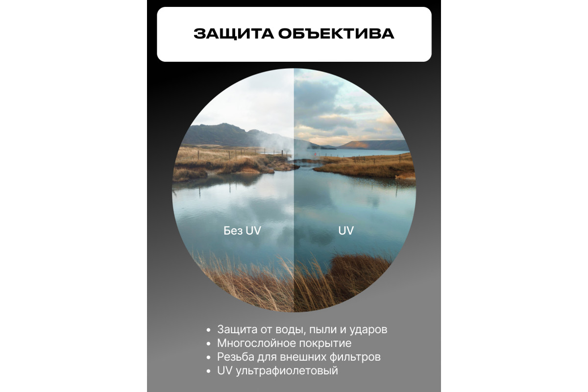 Ультрафиолетовый защитный фильтр с многослойным просветлением, усиленным защитным покрытием и тонкой оправой для постоянного использования. Устраняет воздействие невидимого ультрафиолетового излучения (отсекает лучи с длиной волны короче 410нм.). Изготовлен из высококачественного полированного стекла, что обеспечивает оптическую прозрачность, точность цветопередачи и высокую степень светопропускания. UV-фильтр поглощает ультрафиолетовое излучение и снижает голубоватый оттенок дневного света. Благодаря высокой степени светопропускания и отсутствию искажения при цветопередаче данный фильтр в качестве защитного можно использовать, не снимая, и устанавливать с ним другие фильтры. Фильтр защитит переднюю линзу объектива от попадания пыли, влаги и отпечатков пальцев. Тонкая оправа позволяет использовать фильтр и с широкоугольными объективами.