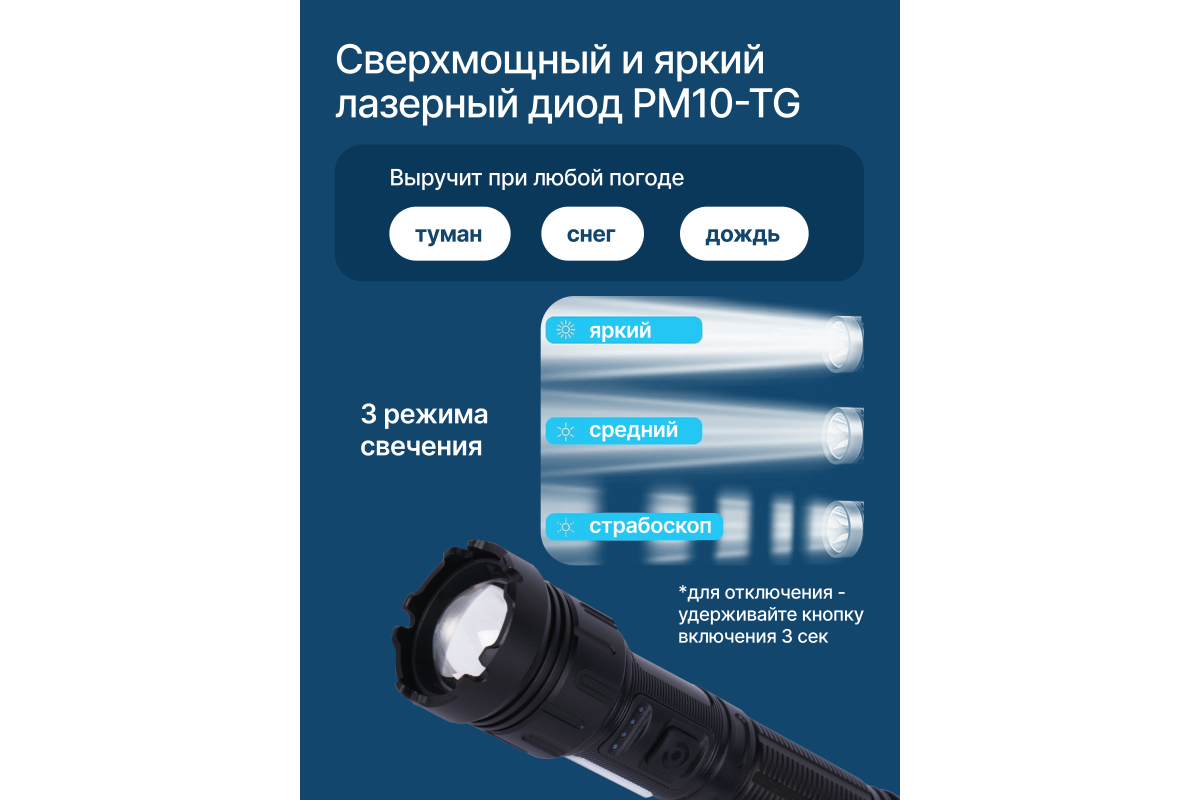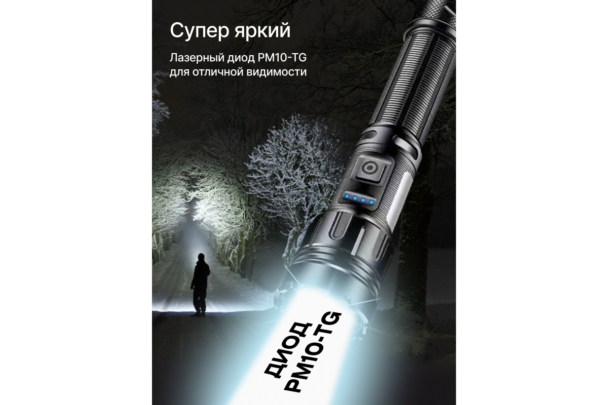 Представляем новинку от Roadlike — лазерный дальнобойный фонарик. Ручной тактический фонарик с лазерным диодом нового поколения PM10-TG оснащен перезаряжаемым аккумулятором 18650, который обеспечивает стабильную работу до 8 часов. Всего у фонарика 7 режимов работы. Основной источник света предлагает три режима: яркий, средний и стробоскоп. Фокусировочная линза позволяет изменять угол рассеивания света от широкого до узконаправленного, а зум осуществляется выдвижением головной части фонарика. Сверхмощный диод обеспечивает дальность свечения до 3000 метров.