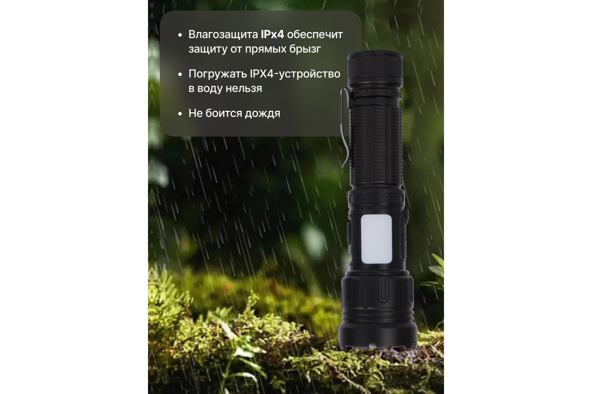 Полезные детали: металлическая клипса обеспечивает надежное крепление на рюкзаке или ремне, а отстегивающийся ремешок предотвратит потерю фонарика. На торце корпуса расположен мощный магнит, позволяющий закрепить фонарик под капотом автомобиля или на других металлических поверхностях. Функция Power Bank выручит вас в любой момент, позволяя зарядить телефон. Данный уровень обеспечит защиту от прямых брызг. IPX4 можно взять с собой, если вы собрались бежать марафон в плохую погоду или решили усиленно потренироваться в зале. Погружать устройство в воду нельзя.