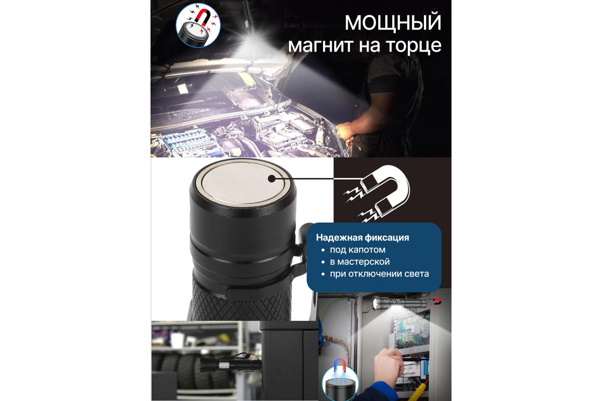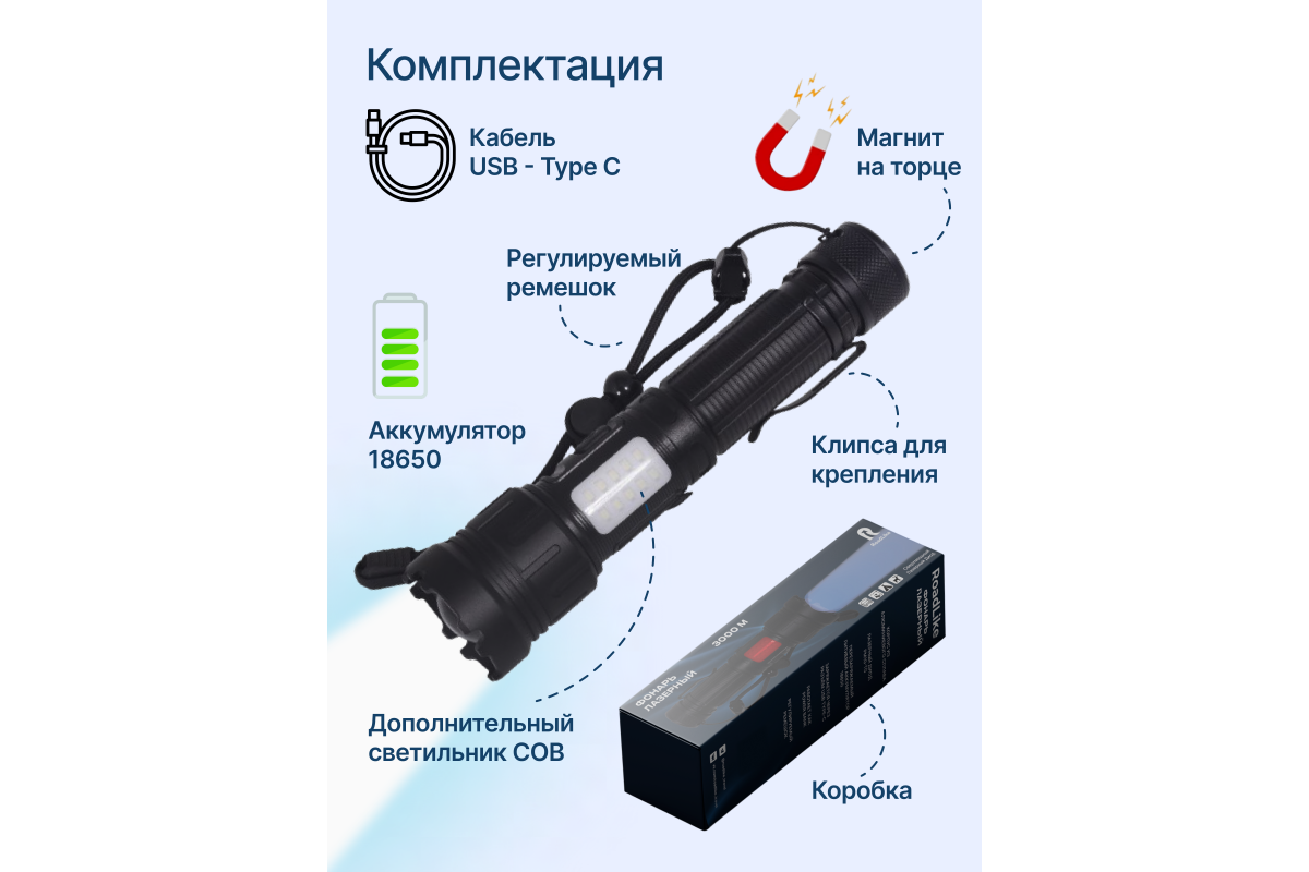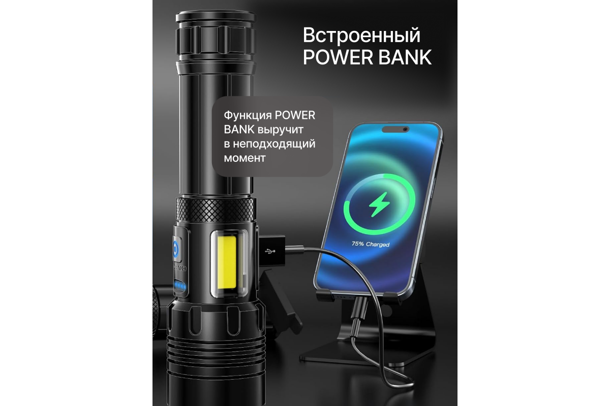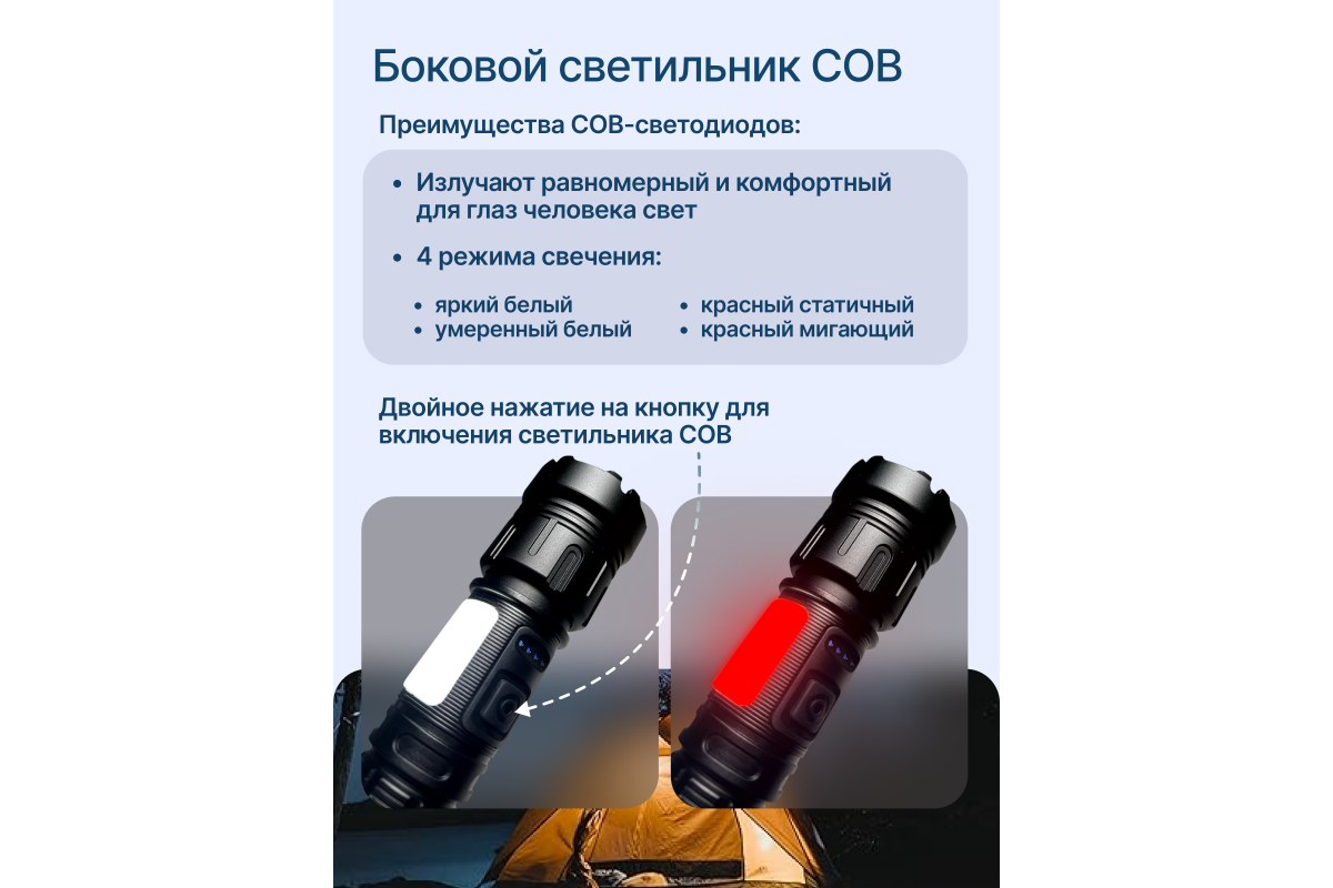 Фонарь также оборудован дополнительным боковым светильником COB LED, который предлагает рассеянное освещение с четырьмя режимами работы: яркий белый, средний белый, красный и мигающий красный для SOS-сигнала. Этот светильник идеально подходит для освещения кемпинга, палатки или гаража. Он станет незаменимым помощником для любителей активного отдыха, рыбалки, охоты и автолюбителей, а также на даче и в гараже.