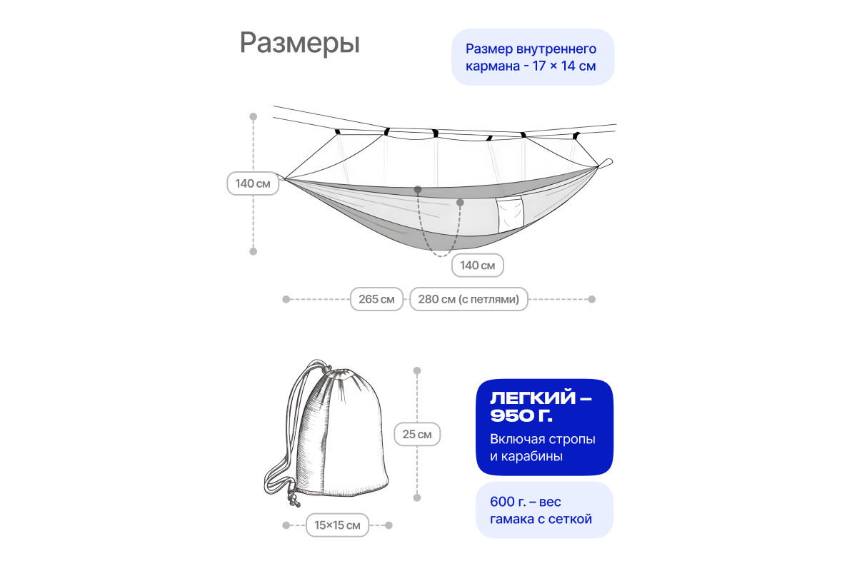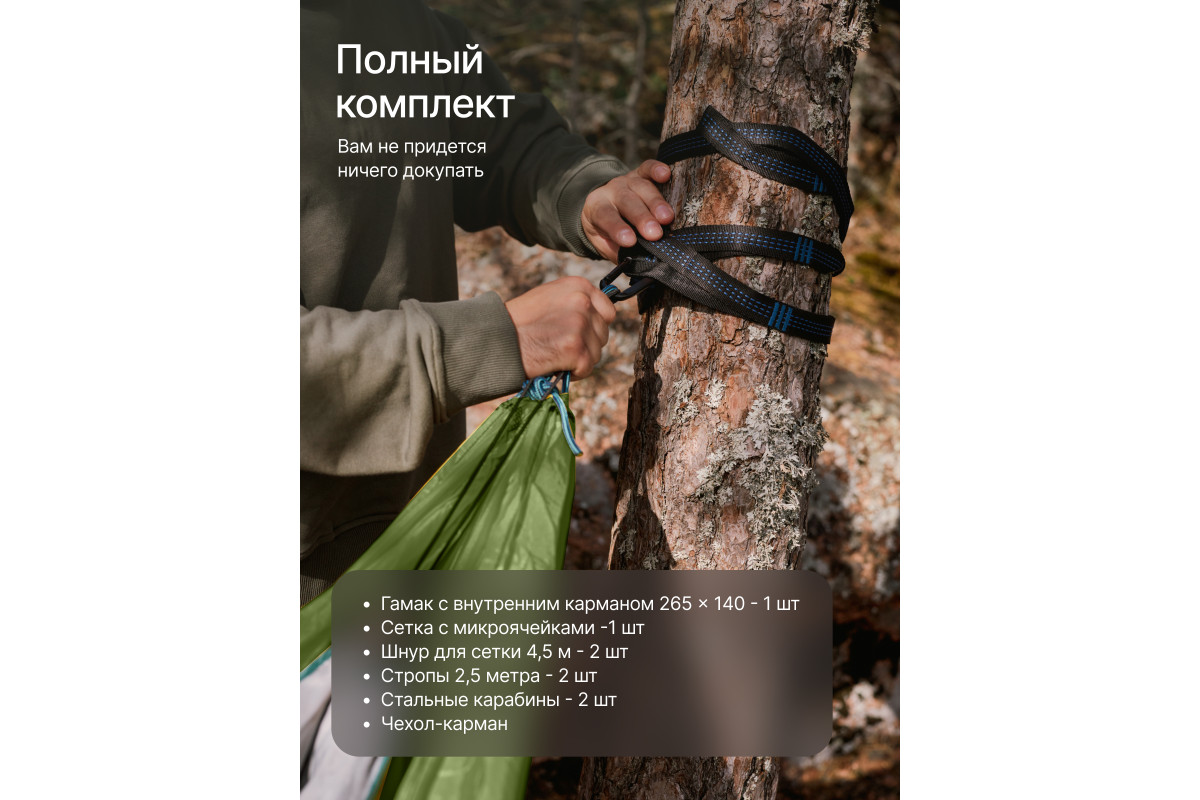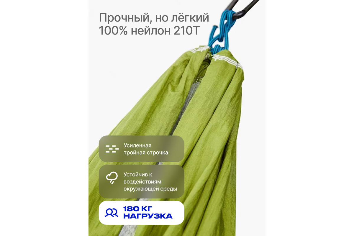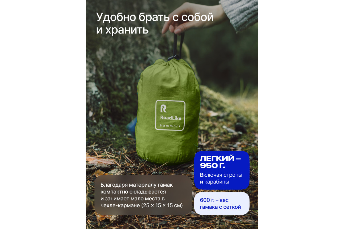 Компактный гамак RoadLike с надежной москитной сеткой - всё что необходимо для идеального отдыха на даче, пикнике или в туристическом походе. Благодаря дышащей и высокопрочной ткани, он выдерживает нагрузку до 180 кг и позволяет полностью расслабиться. Благодаря более широкому размеру 140см, гамак обеспечивает достаточно большое пространство для игры и предотвращает боковое переворачивание, вы можете оставаться на нем безопасно и комфортно. Собирается и складывается в удобный чехол за несколько минут, легко крепится. Продуманный до мелочей - он станет идеальным подарком для любителей комфорта.