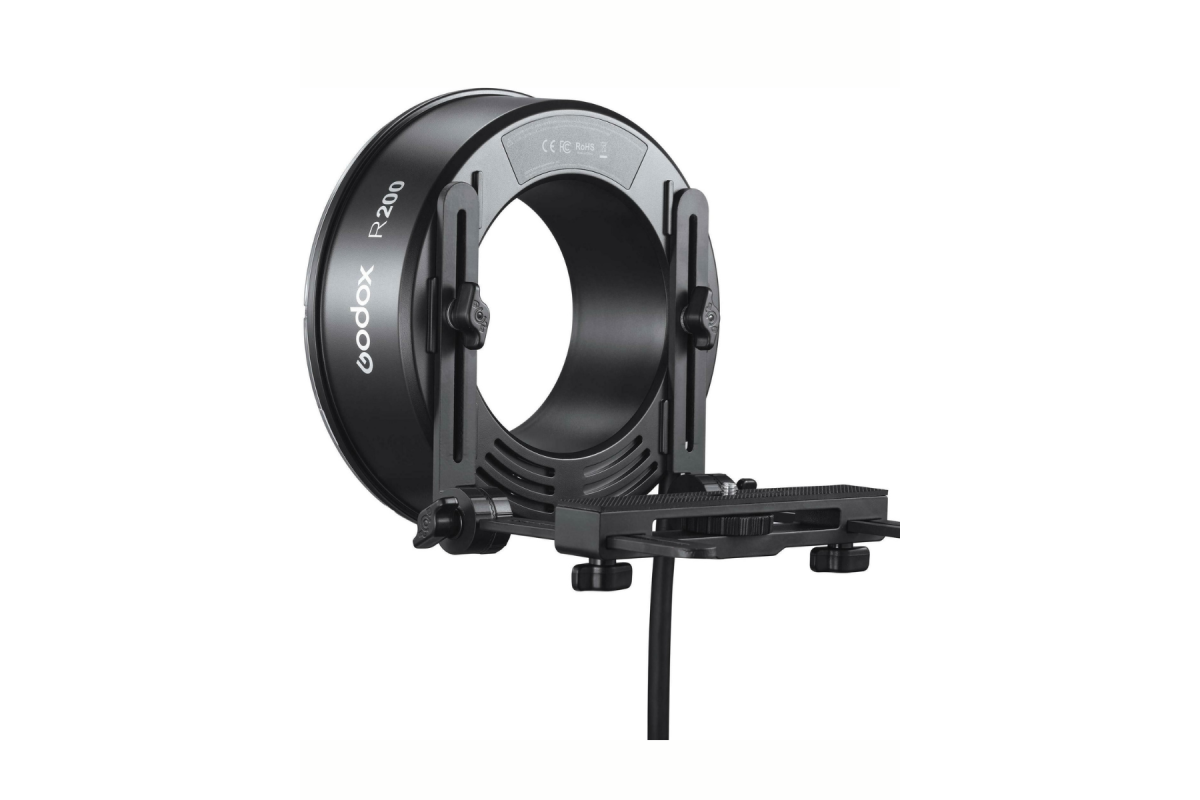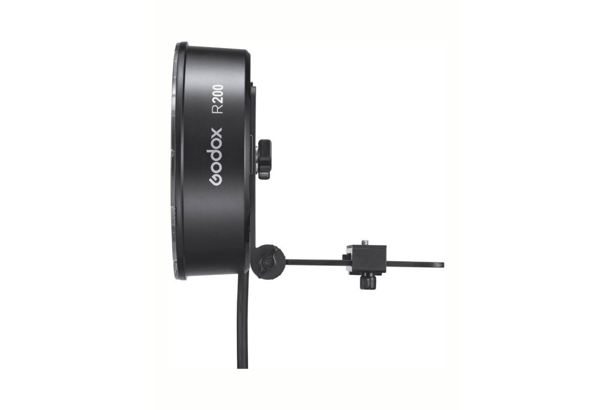 Кронштейн для зонта может использоваться для присоединения к R200 дополнительно приобретаемого параболического зонта Godox. Совместное использование кольцевой вспышки и параболического зонта помогает создать яркое равномерное освещение, которое легко контролировать. Форма кронштейна позволяет регулировать положение зонта относительно источника света для смягчения или затемнения контуров теней.