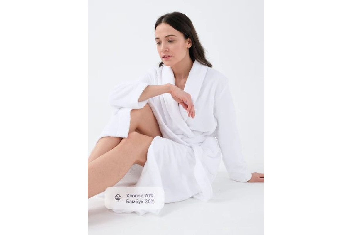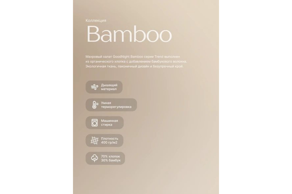 Махровый халат GoodNight Bamboo серии Trend выполнен из 70% хлопка и 30% бамбука - роскошная и бархатистая фактура подарит невероятное тактильное наслаждение. Плотность ткани 400 гр, при такой плотности махра не длинная и не объемная, но прекрасно впитывает влагу и изделие не тяжелое. Комфортная и уютная модель кимоно - в нем вы будете чувствовать себя расслабленной и женственной одновременно. Широкий размерный ряд от 42 до 56 размера - полная свобода передвижения благодаря современному крою.