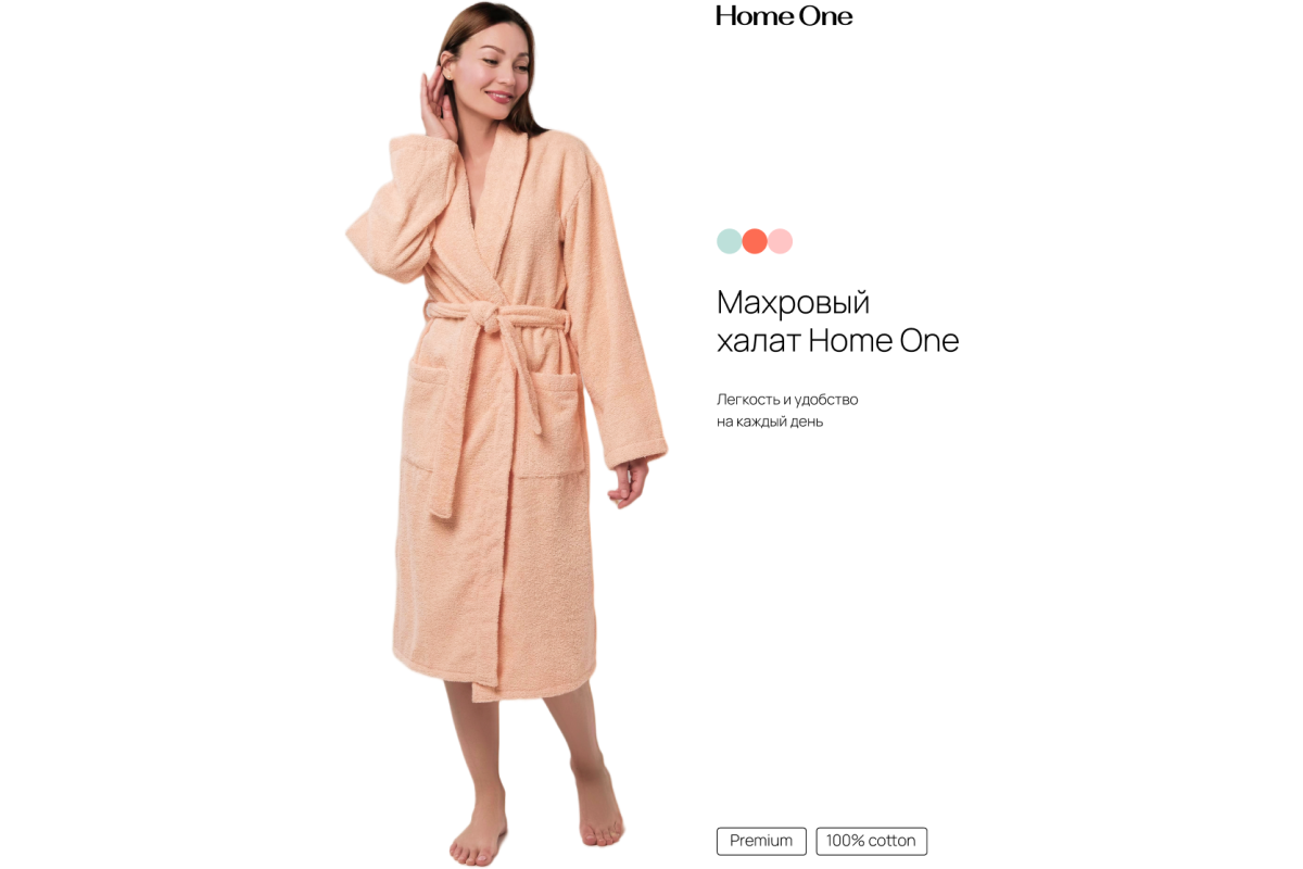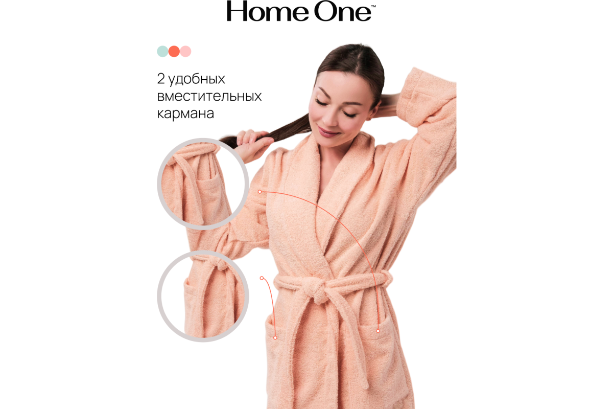Халат махровый Home One выполнен из 100% хлопка. Мягкий, легкий и нежный на ощупь домашний халат, он подарит ощущение комфорта и уюта. Махровый халат Home One прекрасно впитывает влагу, при этом не препятствует свободной циркуляции воздуха, изделие не тяжелое. Обладаете отличными теплосохраняющими качествами и не нарушает естественную терморегуляцию. Махровый халат прекрасно подходит для повседневного использования дома, в бане и бассейне. Не прихотлив в уходе, не садится при стирке, не линяет, выдерживает большое количество стирок без изменения качеств. Home One предлагает широкий размерный ряд от 44 до 54 размеров, стильные и благородные цвета.