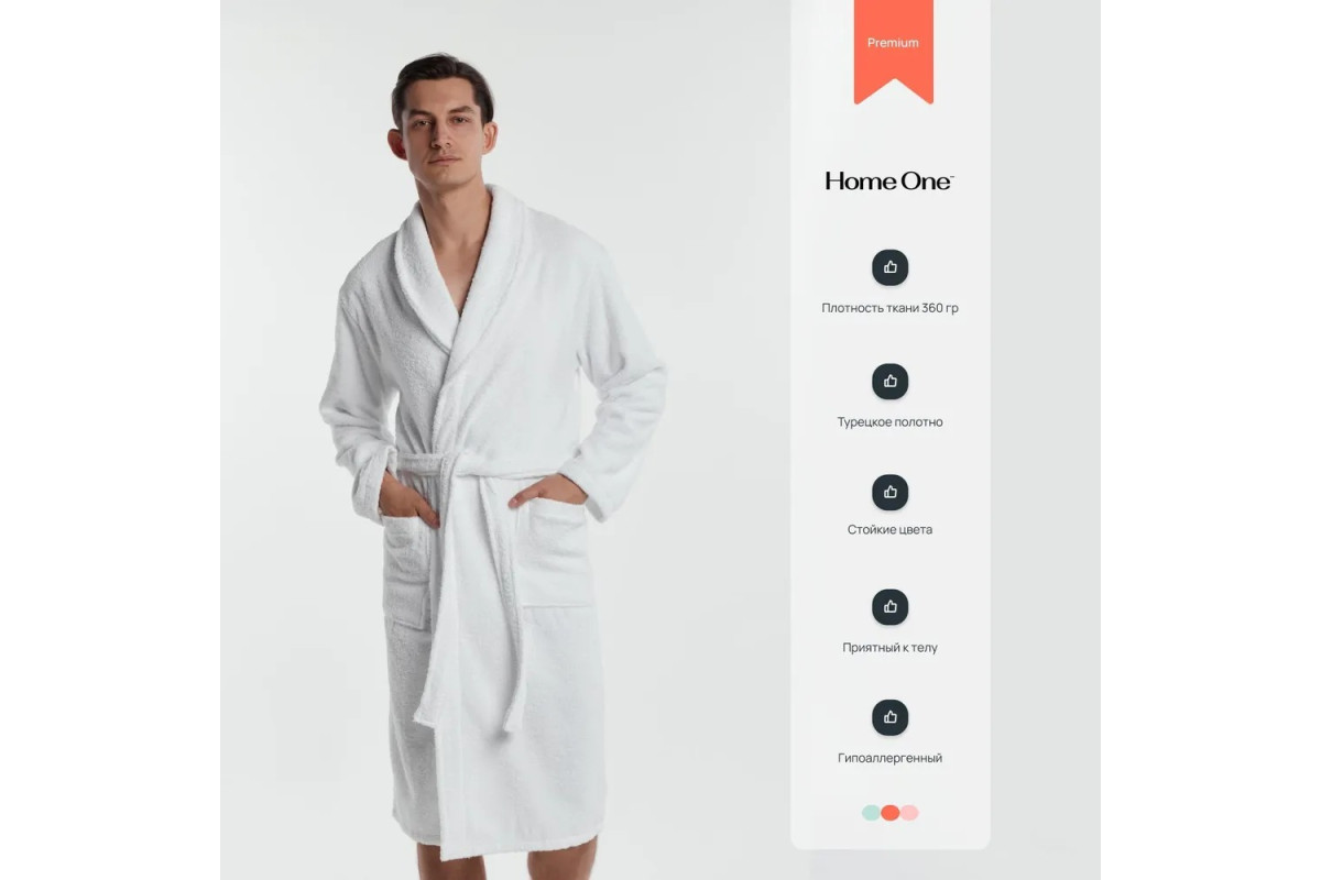 Халат мужской махровый изготовлен из высококачественного натурального, дышащего материала турецкого производства, 100% натуральный хлопок. Плотность ткани 360 гр/м2. Легкий махровый халат Home One прекрасно впитывает влагу, при этом не препятствует свободной циркуляции воздуха. Обладаете отличными теплосохраняющими качествами и не нарушает естественную терморегуляцию. Модель выполнена в классическом стиле имеет длинный широкий рукав, два глубоких накладных кармана, пояс. Длина халата обеспечивает максимальное удобство и легкость при движении. Халат идеально подходит для домашнего использования, на даче, в бане и сауне. Махровый мужской халат Home One подходит для мужчин с любым типом фигуры Изделие может стать отличным и полезным подарком для родных и близких. В целях идеальной посадки при повседневной эксплуатации изделия, халат отшивается с учетом усадки ткани после предварительной стирки. Изделие не теряет цвет.