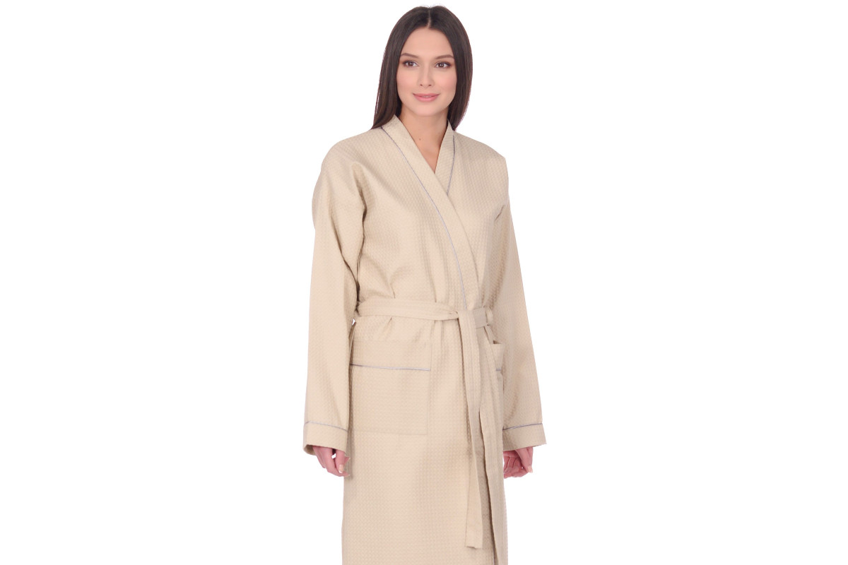 Легкий и стильный халат Home One выполнен из вафельного полотна, плотностью 250гр/м2. Это материал, состоящий из хлопчатобумажных нитей, без добавления синтетики. Халат гарантирует полную свободу, не сковывает движения, и, благодаря плотной ткани, порадует вас длительной ноской. Изделие отделано оригинальным контрастным кантом по воротниковой зоне, на рукавах и карманах. Халат отлично подходит для домашнего использования, обеспечивает комфорт, а ткань обладает тактильно приятной текстурой.