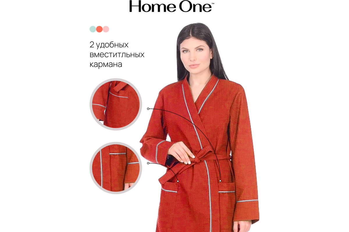 Легкий и стильный халат Home One выполнен из вафельного полотна, плотностью 250гр/м2. Это материал, состоящий из хлопчатобумажных нитей, без добавления синтетики. Халат гарантирует полную свободу, не сковывает движения, и, благодаря плотной ткани, порадует вас длительной ноской. Изделие отделано оригинальным контрастным кантом по воротниковой зоне, на рукавах и карманах. Халат отлично подходит для домашнего использования, обеспечивает комфорт, а ткань обладает тактильно приятной текстурой.