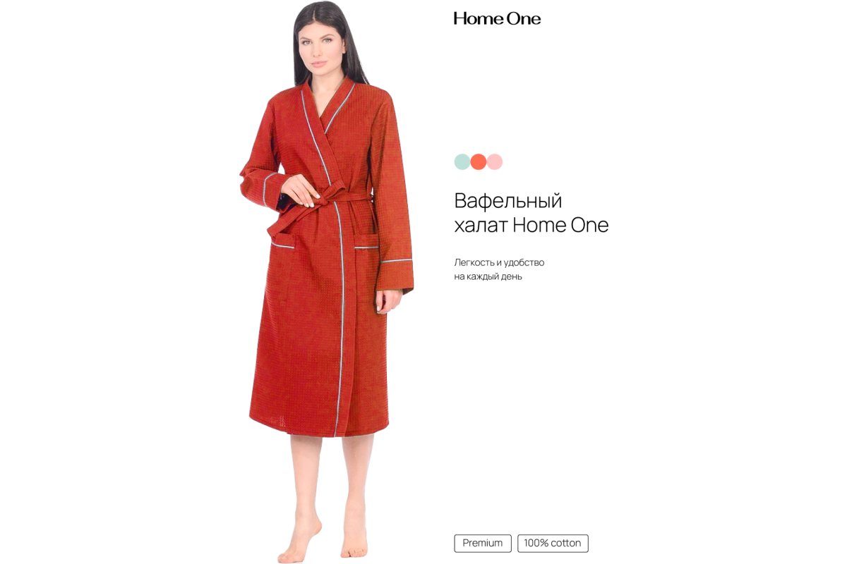 Легкий и стильный халат Home One выполнен из вафельного полотна, плотностью 250гр/м2. Это материал, состоящий из хлопчатобумажных нитей, без добавления синтетики. Халат гарантирует полную свободу, не сковывает движения, и, благодаря плотной ткани, порадует вас длительной ноской. Изделие отделано оригинальным контрастным кантом по воротниковой зоне, на рукавах и карманах. Халат отлично подходит для домашнего использования, обеспечивает комфорт, а ткань обладает тактильно приятной текстурой.
