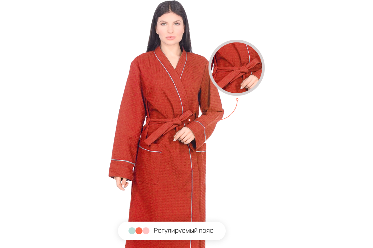 Легкий и стильный халат Home One выполнен из вафельного полотна, плотностью 250гр/м2. Это материал, состоящий из хлопчатобумажных нитей, без добавления синтетики. Халат гарантирует полную свободу, не сковывает движения, и, благодаря плотной ткани, порадует вас длительной ноской. Изделие отделано оригинальным контрастным кантом по воротниковой зоне, на рукавах и карманах. Халат отлично подходит для домашнего использования, обеспечивает комфорт, а ткань обладает тактильно приятной текстурой.