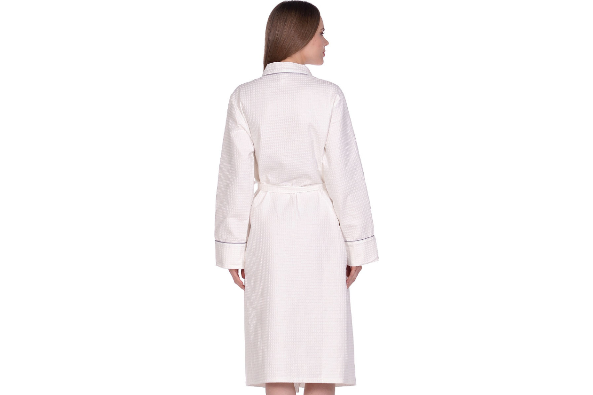 Легкий и стильный халат Home One выполнен из вафельного полотна, плотностью 250гр/м2. Это материал, состоящий из хлопчатобумажных нитей, без добавления синтетики. Халат гарантирует полную свободу, не сковывает движения, и, благодаря плотной ткани, порадует вас длительной ноской. Изделие отделано оригинальным контрастным кантом по воротниковой зоне, на рукавах и карманах. Халат отлично подходит для домашнего использования, обеспечивает комфорт, а ткань обладает тактильно приятной текстурой.