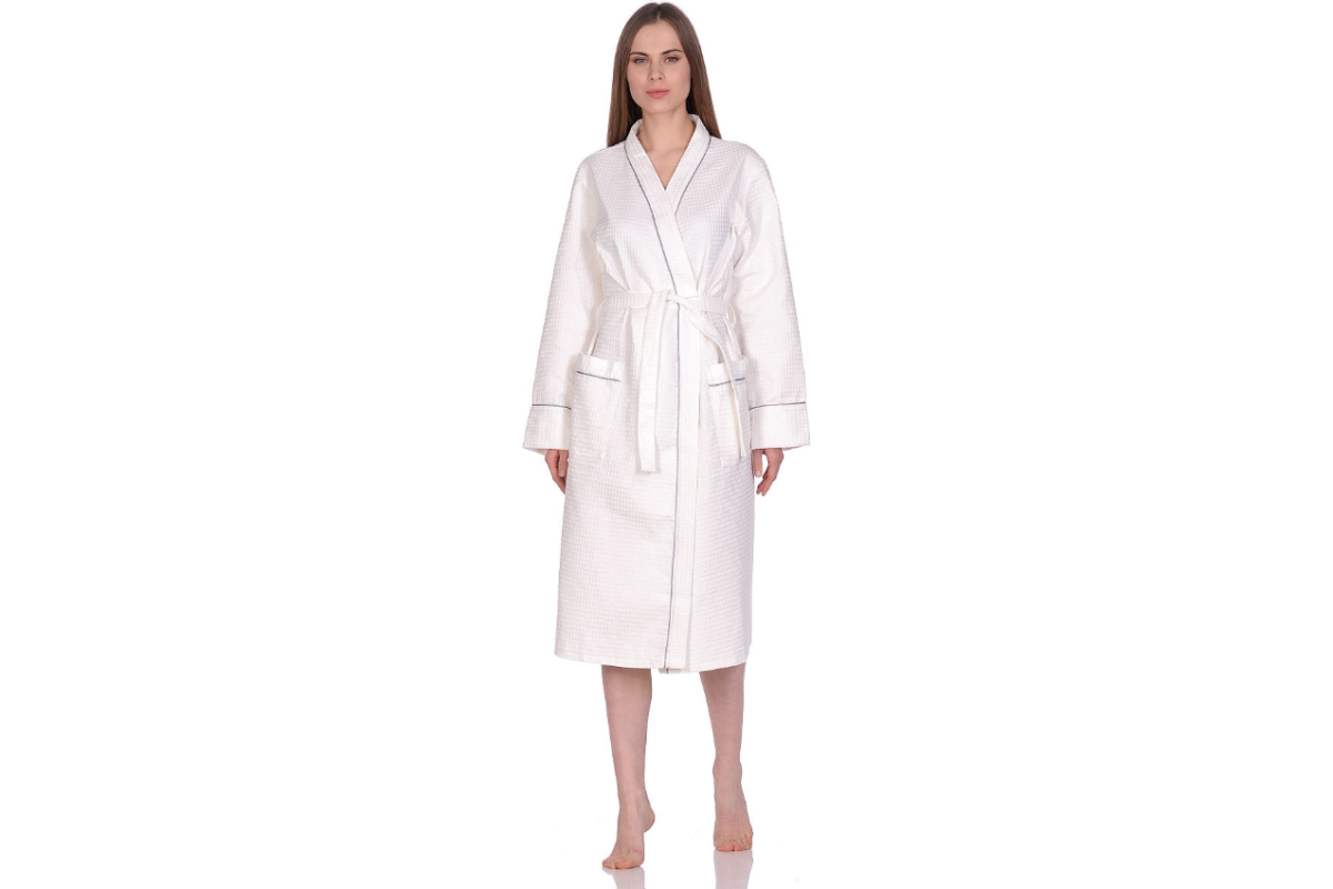 Легкий и стильный халат Home One выполнен из вафельного полотна, плотностью 250гр/м2. Это материал, состоящий из хлопчатобумажных нитей, без добавления синтетики. Халат гарантирует полную свободу, не сковывает движения, и, благодаря плотной ткани, порадует вас длительной ноской. Изделие отделано оригинальным контрастным кантом по воротниковой зоне, на рукавах и карманах. Халат отлично подходит для домашнего использования, обеспечивает комфорт, а ткань обладает тактильно приятной текстурой.