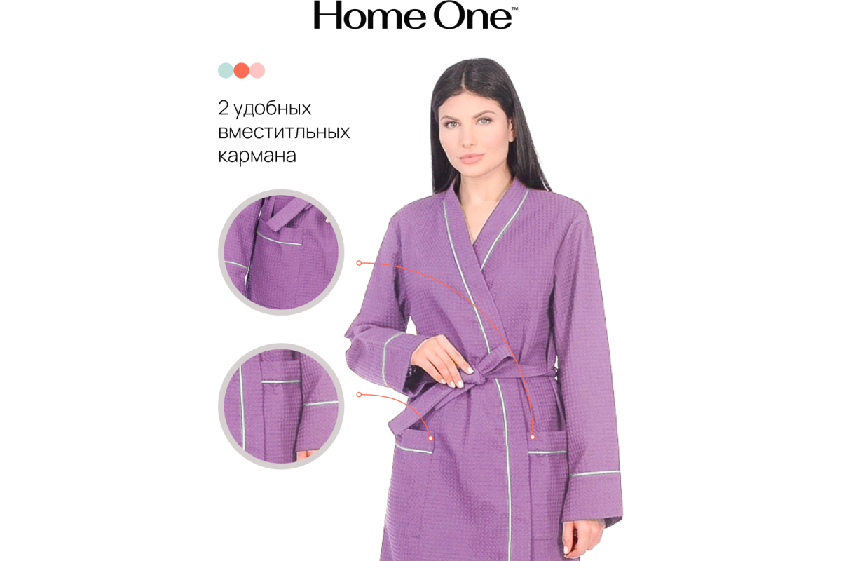 Легкий и стильный халат Home One выполнен из вафельного полотна, плотностью 250гр/м2. Это материал, состоящий из хлопчатобумажных нитей, без добавления синтетики. Халат гарантирует полную свободу, не сковывает движения, и, благодаря плотной ткани, порадует вас длительной ноской. Изделие отделано оригинальным контрастным кантом по воротниковой зоне, на рукавах и карманах. Халат отлично подходит для домашнего использования, обеспечивает комфорт, а ткань обладает тактильно приятной текстурой.