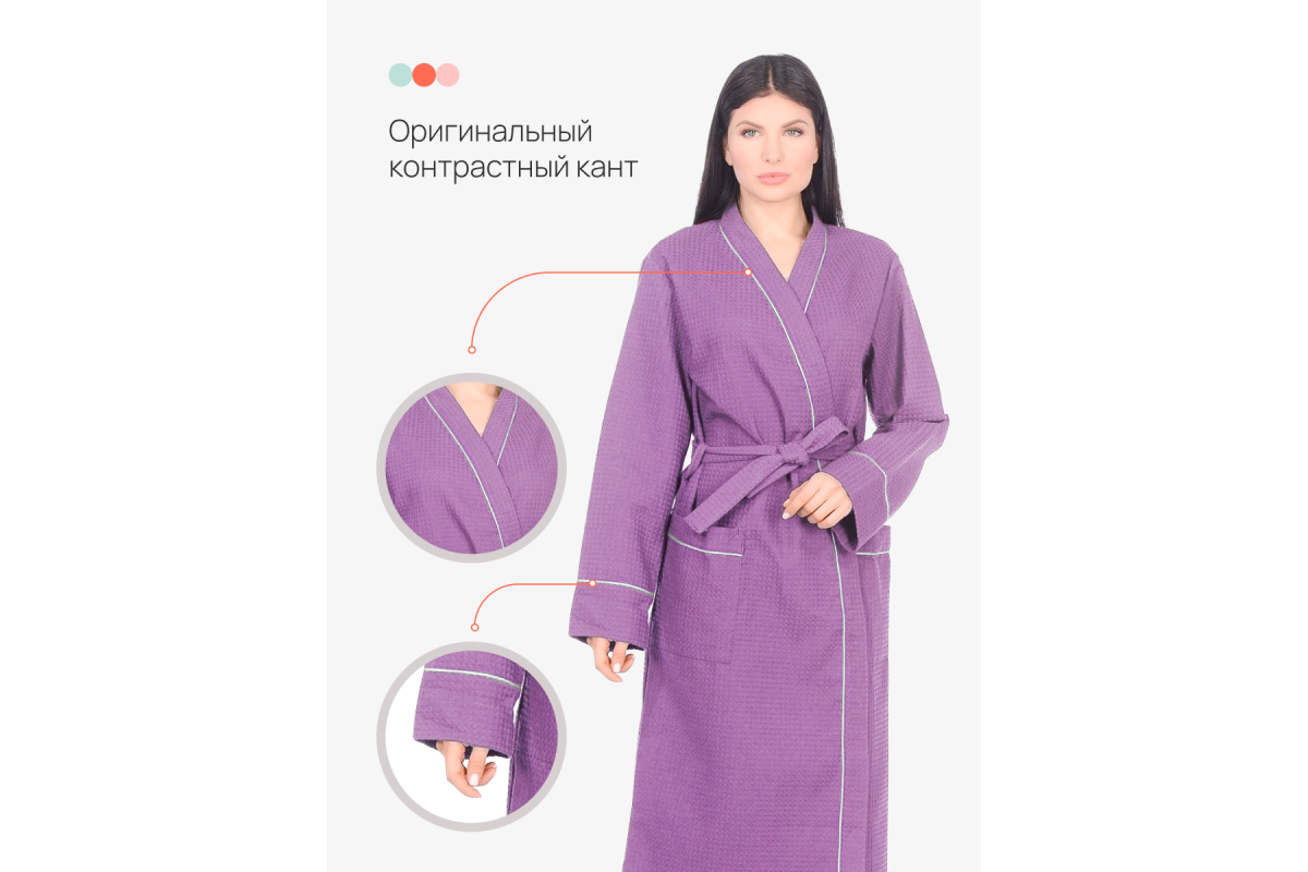 Легкий и стильный халат Home One выполнен из вафельного полотна, плотностью 250гр/м2. Это материал, состоящий из хлопчатобумажных нитей, без добавления синтетики. Халат гарантирует полную свободу, не сковывает движения, и, благодаря плотной ткани, порадует вас длительной ноской. Изделие отделано оригинальным контрастным кантом по воротниковой зоне, на рукавах и карманах. Халат отлично подходит для домашнего использования, обеспечивает комфорт, а ткань обладает тактильно приятной текстурой.