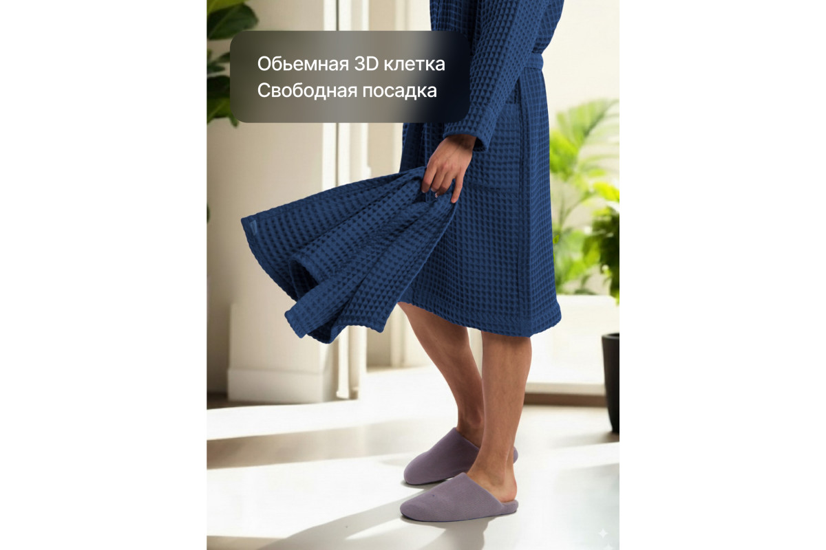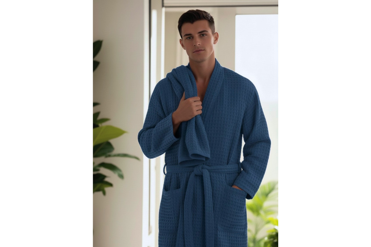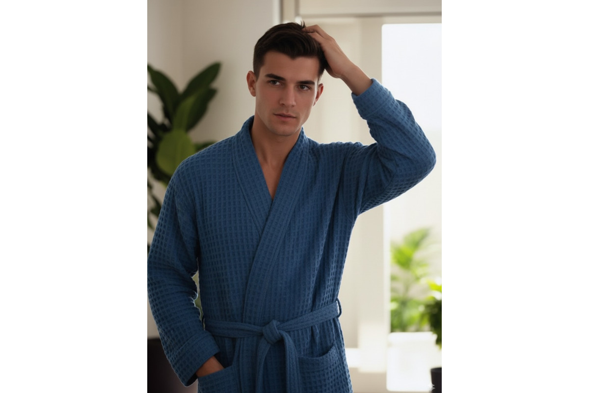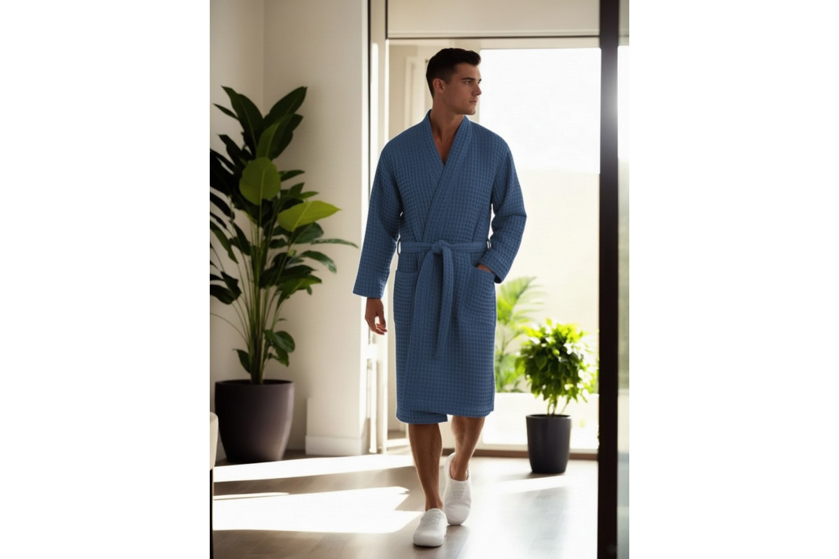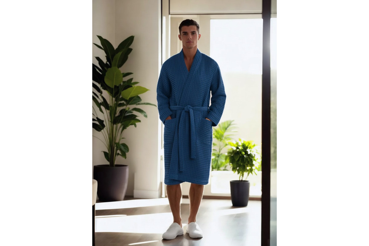 Халат мужской домашний изготовлен из натурального, дышащего материала, 100% хлопок. Вафельное полотно ячейкой 12*12 мм., плотность ткани 240 гр/м2., со специальной обработкой "Аэро" умягчение, которая делает ткань мягкой, воздушной с ярко выраженной вафельной ячейкой. Вафельная структура ткани делает изделие легким и комфортным. Отлично впитывает влагу.