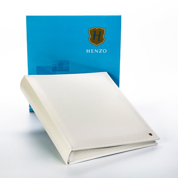Традиционный альбом в книжном переплёте с обложкой из высококачественной искусственной кожи с хорошо выраженной структурой и строчкой по всему периметру. Кроме этого альбом украшен металлическим логотипом Henzo в виде буквы ""H"".