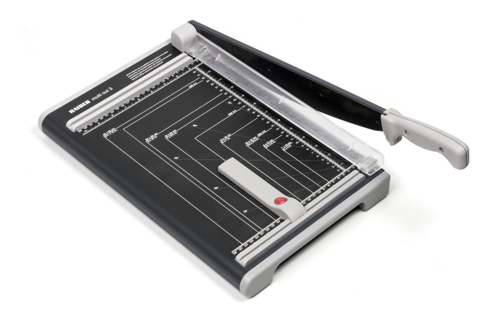 Направляющие по углам с обеих сторон для обрезки под прямым углом, со шкалами в см и дюймах. Съёмный магнитный задний упор.