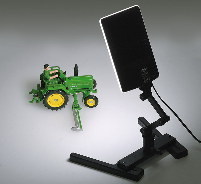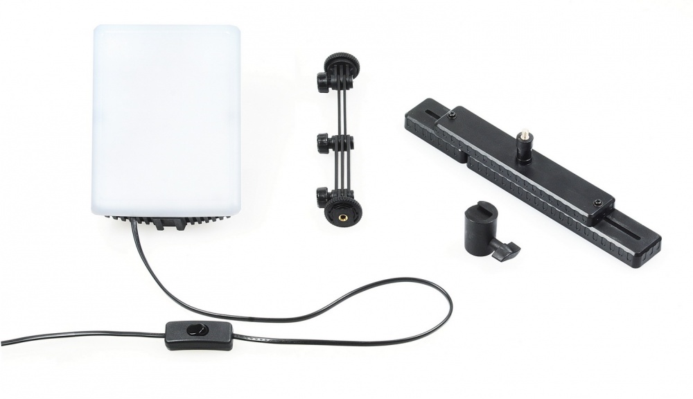 Оснащен регулируемой ножкой и гибким кронштейном с тремя стопорными шарнирами. Складывается до компактного размера.