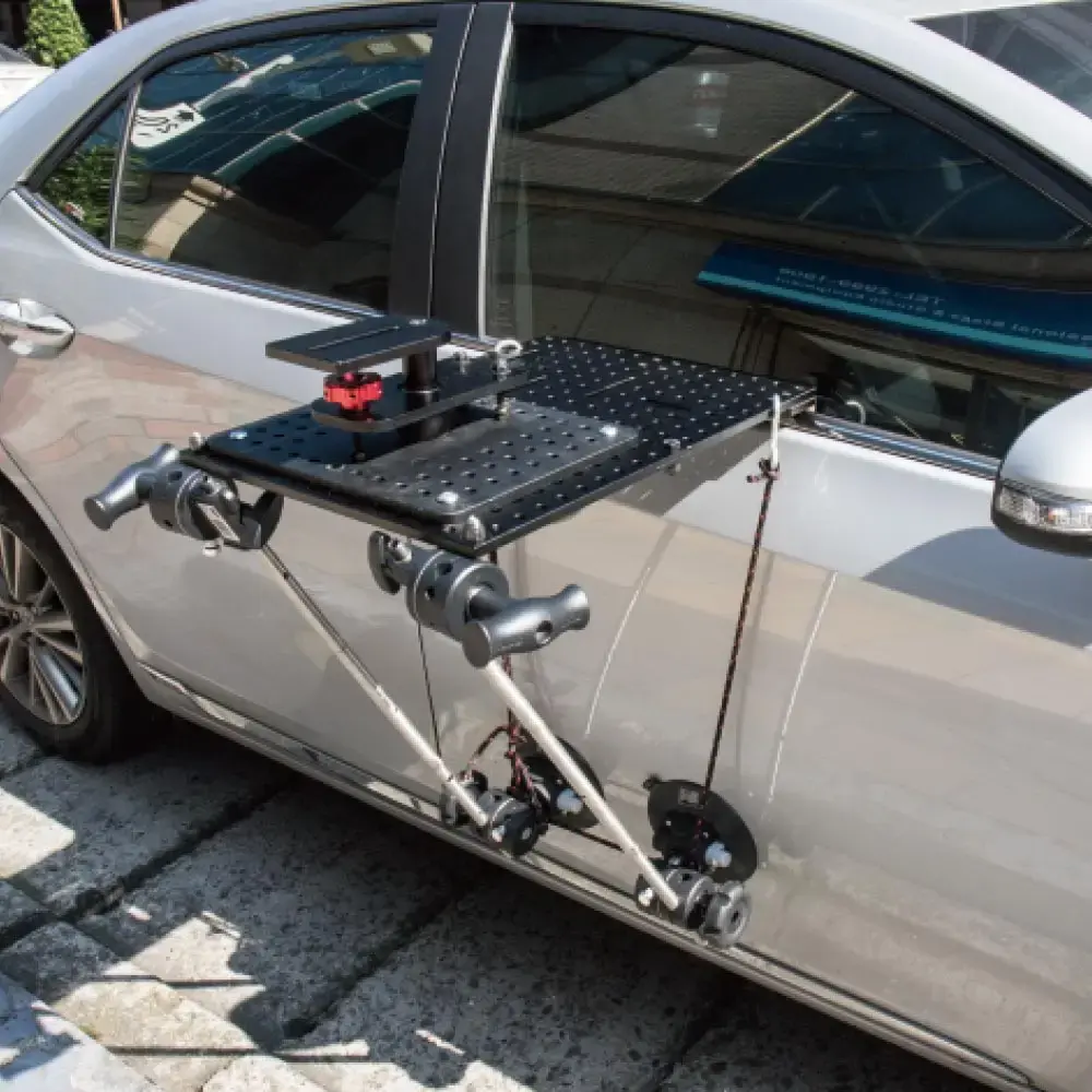 Комплект KUPO KSC-280K Hostess Tray представляет собой решение для надежной установки камеры на внешней стороне двери автомобиля. Нержавеющая стальная пластина толщиной менее 1 мм вставляется между стеклом и резиновым уплотнителем двери, образуя основание для крепления алюминиевой монтажной платформы Cheese Plate размером 14x20". Эта площадка служит жесткой опорой для камеры или другого оборудования, необходимого при съемках в автомобиле. Для повышения устойчивости предусмотрена дополнительная опора из вакуумных присосок, крепежных головок и стальных штанг диаметром 16 мм (5/8"). В комплект входят две страховочные стропы с храповым механизмом, предотвращающие выпадение конструкции во время движения. Простая и быстрая установка позволяет оператору свободно заходить и выходить из машины, не демонтируя площадку. Hostess Tray – идеальное решение для съемки сбоку от автомобиля с полным доступом внутрь.
