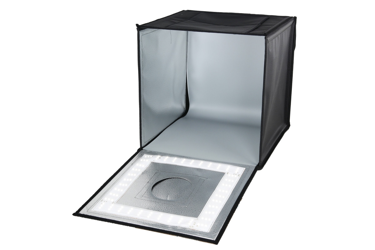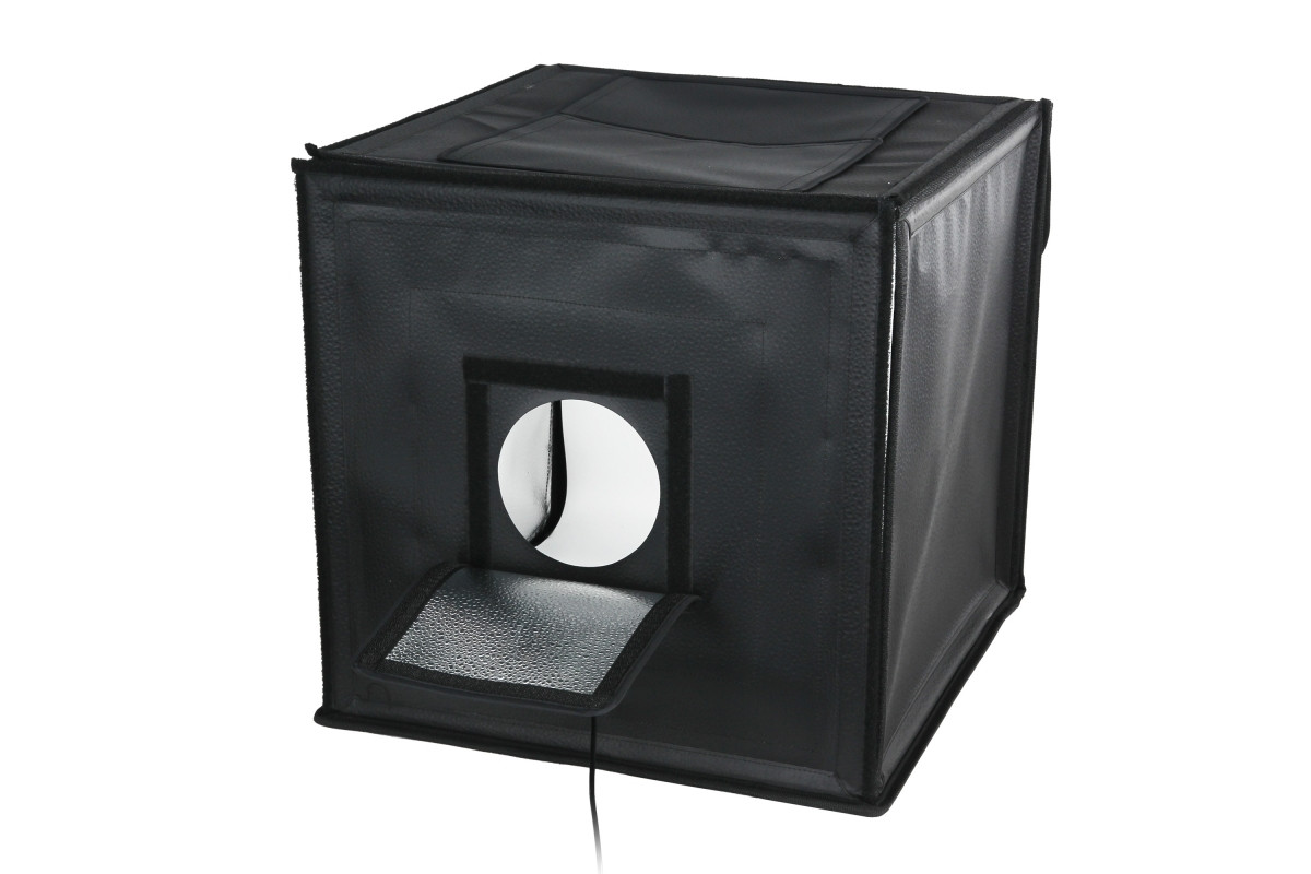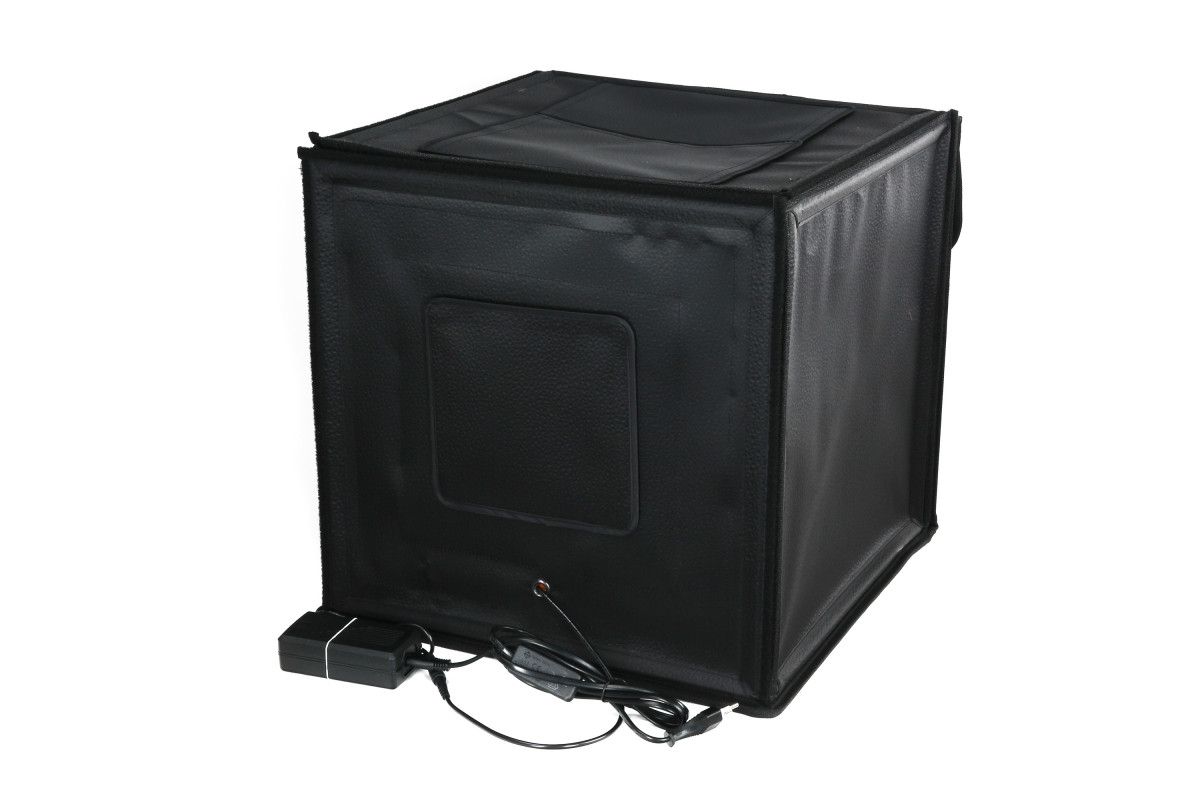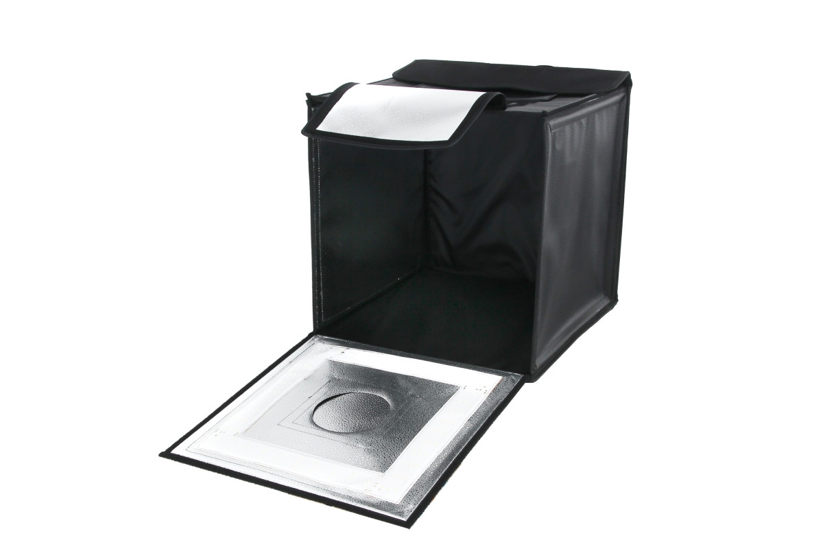 Удивительно легкий, компактный и недорогой переносной комплект света для быстрой предметной фотосъемки любыми фотокамерами. Представляет из себя разборно -сборный чехол- куб с ребром 40x40x40 см , который в сложенном состоянии - это чехол с ручкой, а в разложеноом состоянии пересобирается в лайт куб с внутренними отражающими стенками. Сборка производится очень быстро, так как куб внутри держится на креплениях-"липучках", пришитых внутри по ребрам куба. В коробке с чехлом -кубом также имеются 4 сменных пластиковых фона (белый,серый,черный и цвета крем-брюле). Фоны вкладываются внутрь и дают ровную поверхность, на которую ставится снимаемый предмет. Куб имеет на внутренней поверхности одной из стенок (верхняя стенка) мощную светодиодную подсветку и сетевой блок питания (220 в) для нее во внешнем кармане. Светодиодная подсветка дает сильное и практически бестеневое освещение внутри куба. Световой поток такой, что его хватает для яркого освещения со всех сторон любого предмета, помещенного внутрь. Куб имеет два открывающихся окна (закрываемые шторками на липучках) - в передней части большое, с продолговатым по вертикали вырезом, чтобы можно было через него вносить-выносить и снимать предмет с любого удобного ракурса по вертикали, и второе - круглое окно для объектива на верхней части куба, для фотосъемки "в лоб" мелких предметов, положенных внутри куба.