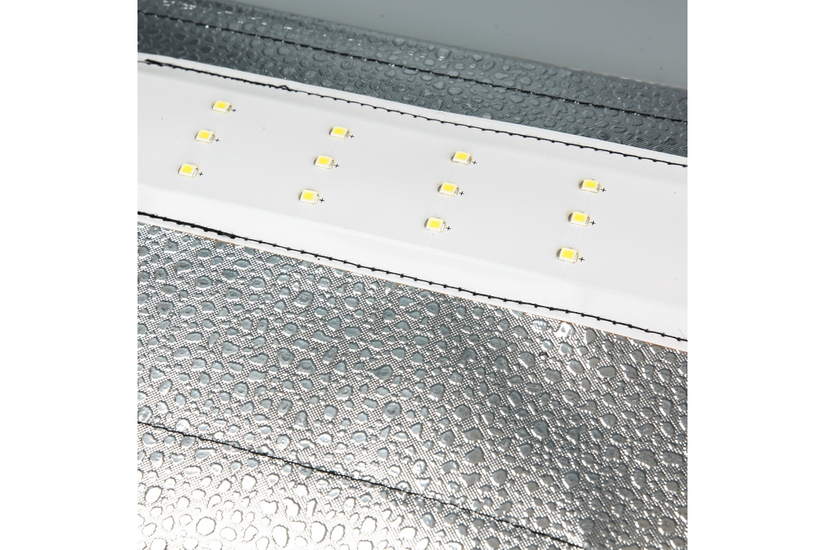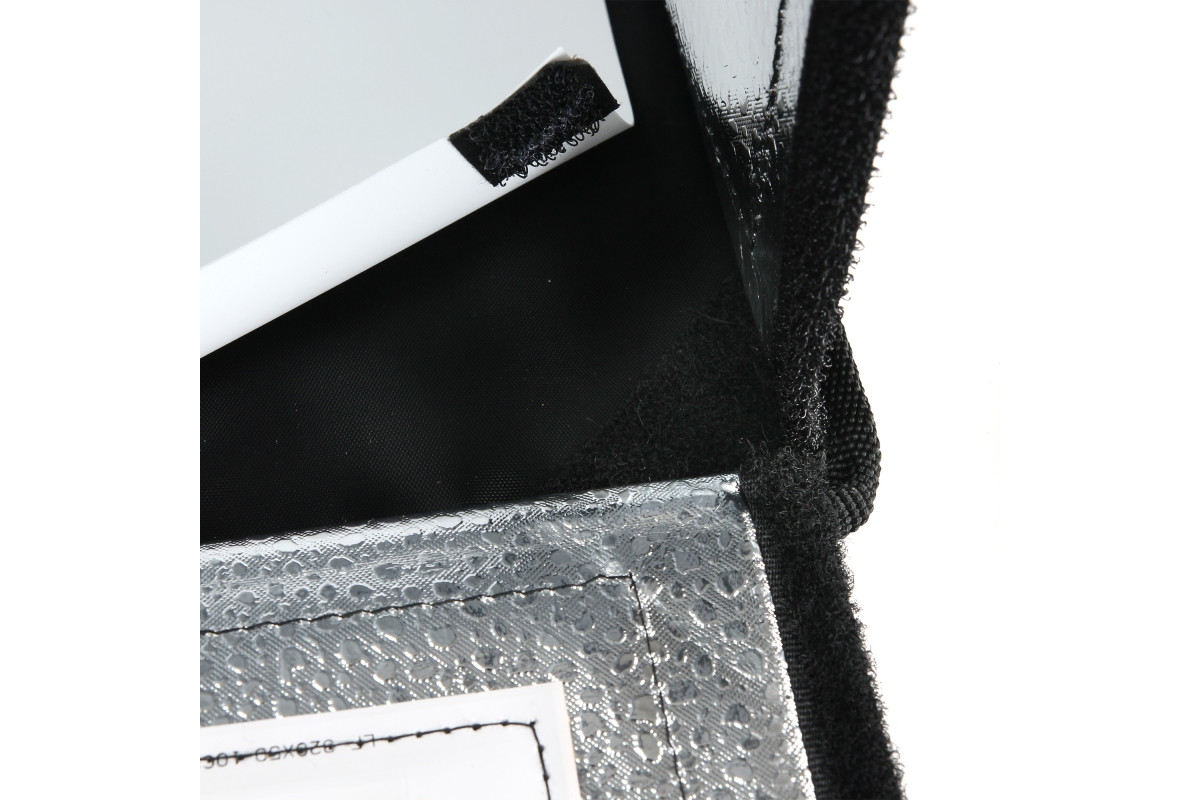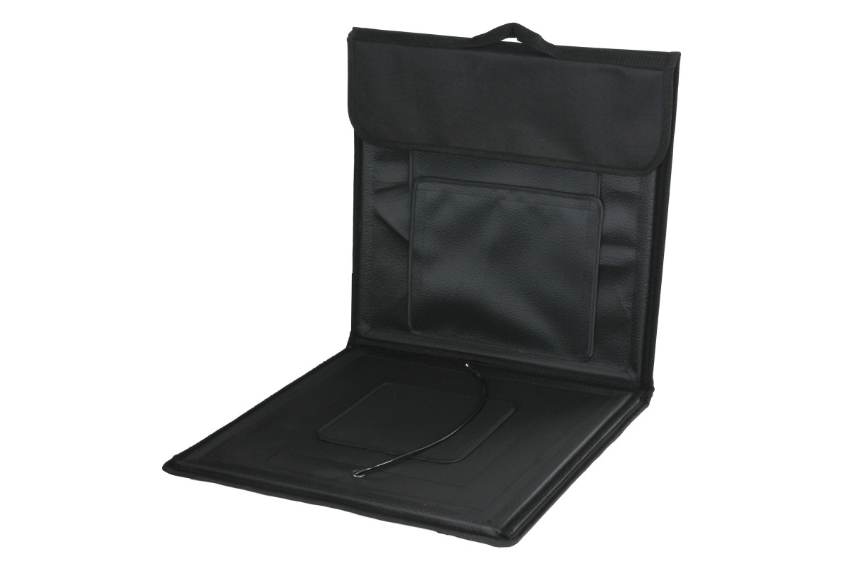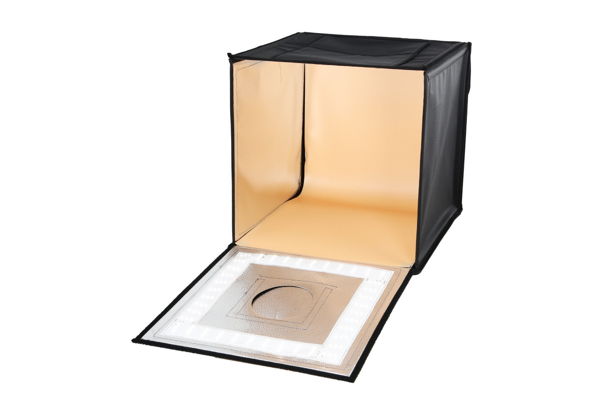 Удивительно легкий, компактный и недорогой переносной комплект света для быстрой предметной фотосъемки любыми фотокамерами. Представляет из себя разборно -сборный чехол- куб с ребром 40x40x40 см , который в сложенном состоянии - это чехол с ручкой, а в разложеноом состоянии пересобирается в лайт куб с внутренними отражающими стенками. Сборка производится очень быстро, так как куб внутри держится на креплениях-"липучках", пришитых внутри по ребрам куба. В коробке с чехлом -кубом также имеются 4 сменных пластиковых фона (белый,серый,черный и цвета крем-брюле). Фоны вкладываются внутрь и дают ровную поверхность, на которую ставится снимаемый предмет. Куб имеет на внутренней поверхности одной из стенок (верхняя стенка) мощную светодиодную подсветку и сетевой блок питания (220 в) для нее во внешнем кармане. Светодиодная подсветка дает сильное и практически бестеневое освещение внутри куба. Световой поток такой, что его хватает для яркого освещения со всех сторон любого предмета, помещенного внутрь. Куб имеет два открывающихся окна (закрываемые шторками на липучках) - в передней части большое, с продолговатым по вертикали вырезом, чтобы можно было через него вносить-выносить и снимать предмет с любого удобного ракурса по вертикали, и второе - круглое окно для объектива на верхней части куба, для фотосъемки "в лоб" мелких предметов, положенных внутри куба.