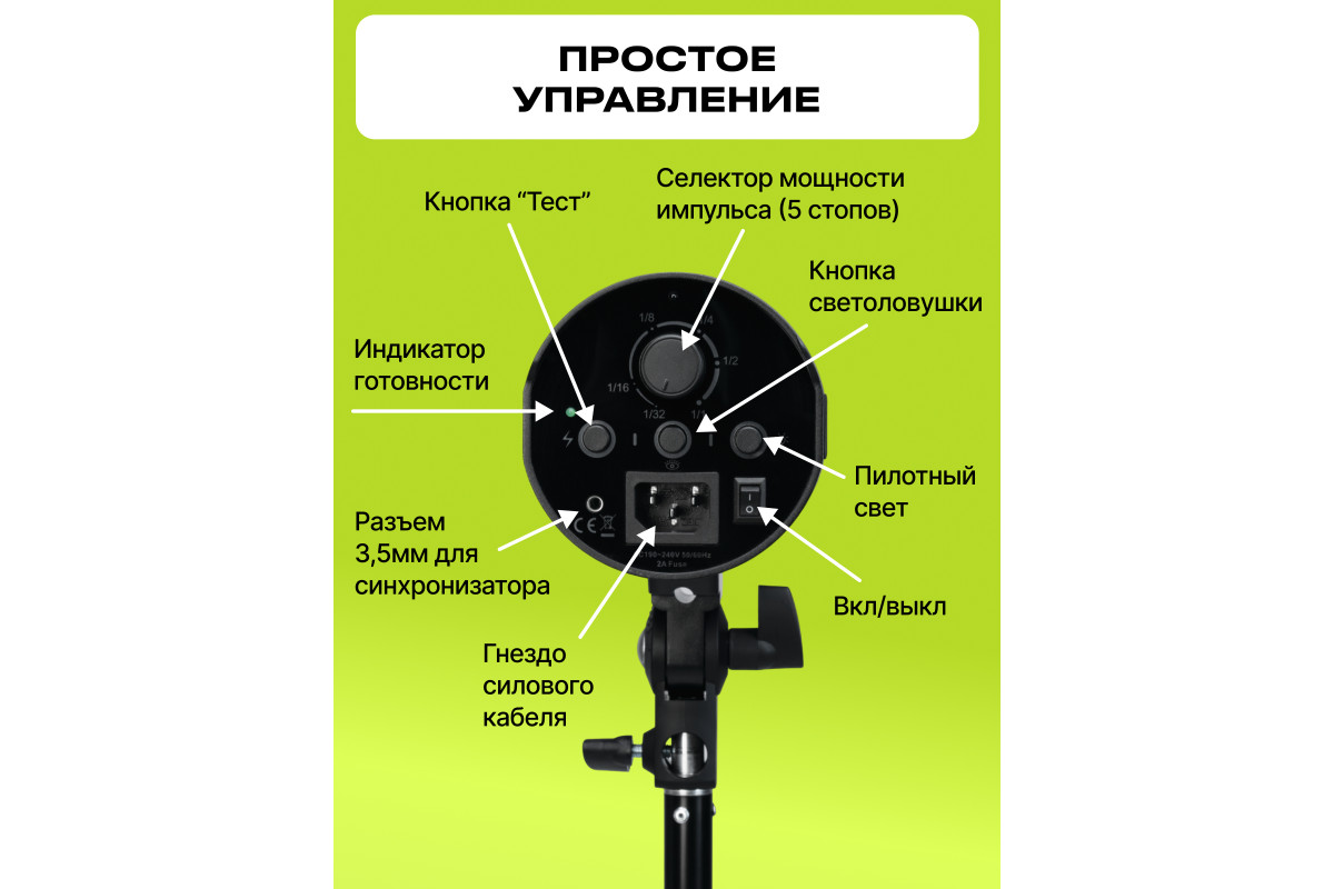 2 современных компактных моноблока с ведущим числом 55, мощностью 250Дж, со светодиодным пилотным светом, регулировкой мощности 1/1-1/32, стабильной цветовой температурой 5500+/-200К и быстрой перезарядкой 1,3 сек.