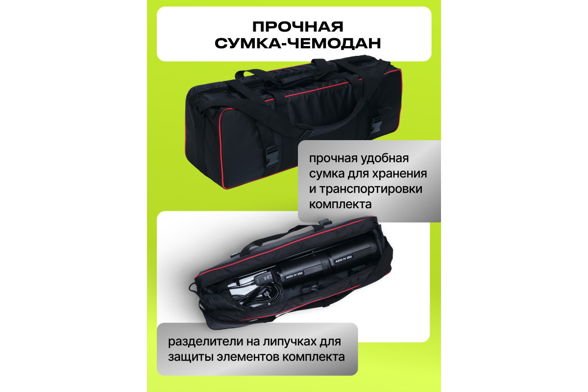 Комплектация: Студийная вспышка Raylab Axio IV 250 -2шт, стойка-тренога - 2шт, софтбокс 50*70см - 1шт, октобокс 60см - 1шт, синхронизатор (передатчик + приемник) - 1шт, кабель питания - 2шт, сумка-кейс для хранения и переноски - 1шт.
