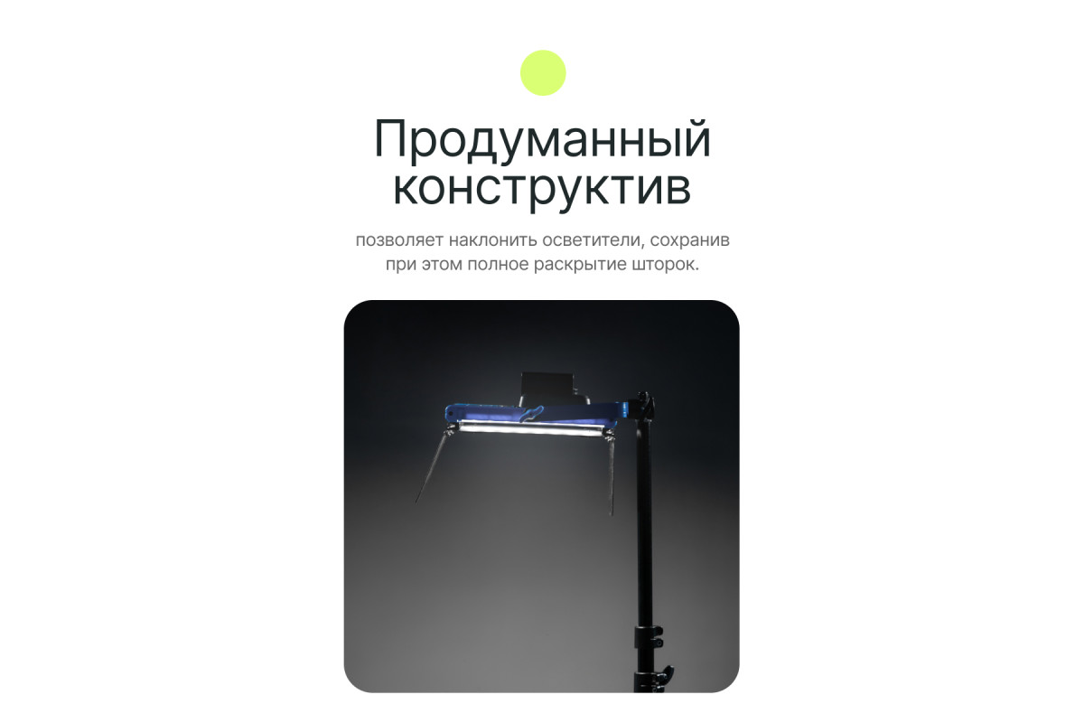 Комплект включает 2 стойки, 2 осветителя и сумку.