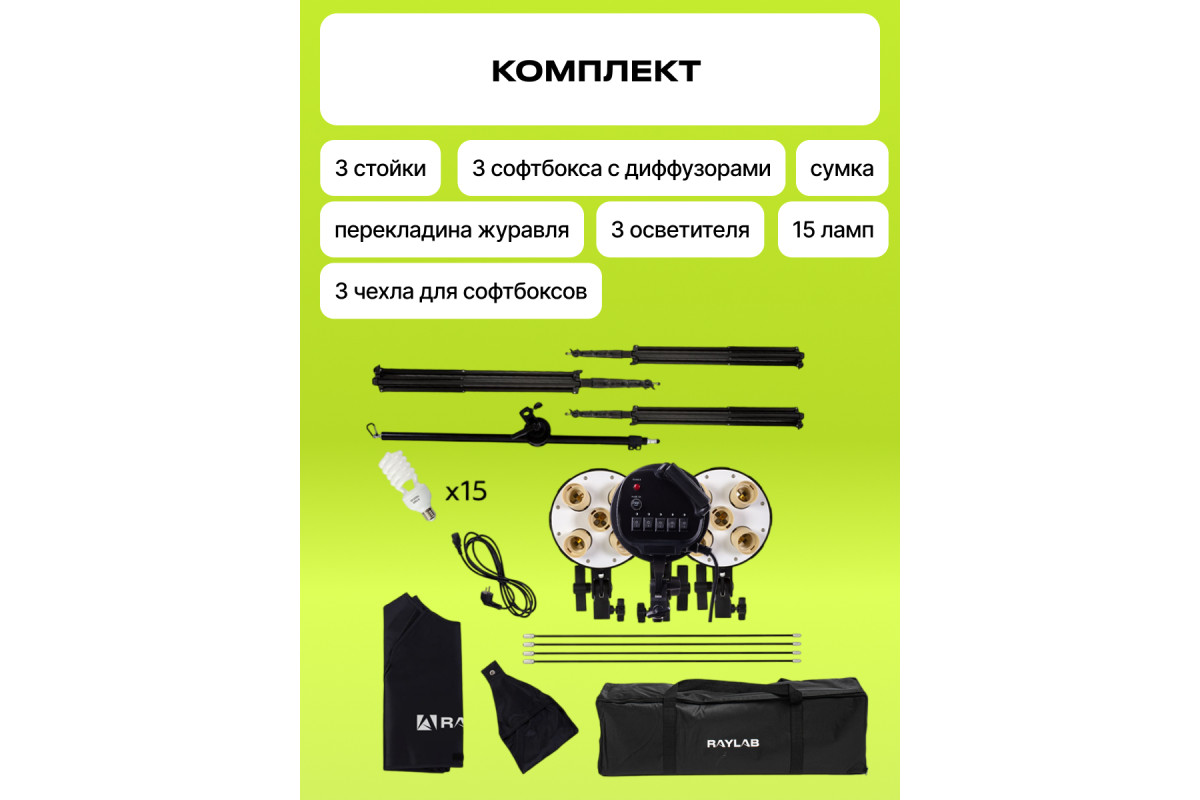 Комплект постоянного света Raylab Solar 3B флюоресцентный - готовое решение для студийной съемки, для создания качественного освещения. Этот комплект предлагает вам все необходимое для достижения замечательных результатов. Основными характеристиками комплекта являются его мощность и цветовая температура. Комплект оснащен пятью 32-ваттными флуоресцентными лампами, обеспечивающими яркое и равномерное освещение. Цветовая температура составляет 5600K±200K, что придает вашим снимкам естественный и профессиональный вид. В комплект входят три софтбокса с рассеивателями, которые помогут создать мягкий и рассеянный свет, и три стойки для установки осветительных приборов в нужном положении. Также в комплект входит перекладина журавля, позволяющая размещать осветительные приборы в нужных точках. Для удобства использования и контроля мощности освещения предусмотрены три выключателя, позволяющие включать от одной до всех пяти ламп одновременно. Это дает вам возможность точно настроить освещение согласно вашим потребностям и требованиям съемки. Комплект постоянного света Raylab Solar 3B флюоресцентный также отличается простотой в использовании и надежностью. Он работает от стандартного сетевого напряжения AC 220В/50Гц, и в комплекте идет сетевой кабель длиной 3 метра. Комплект имеет компактные размеры в упаковке (83x22x33 см), что облегчает его хранение и транспортировку. Гарантия производителя на комплект постоянного света Raylab Solar 3B флюоресцентный составляет 1 год, что подтверждает высокое качество и надежность этого продукта.