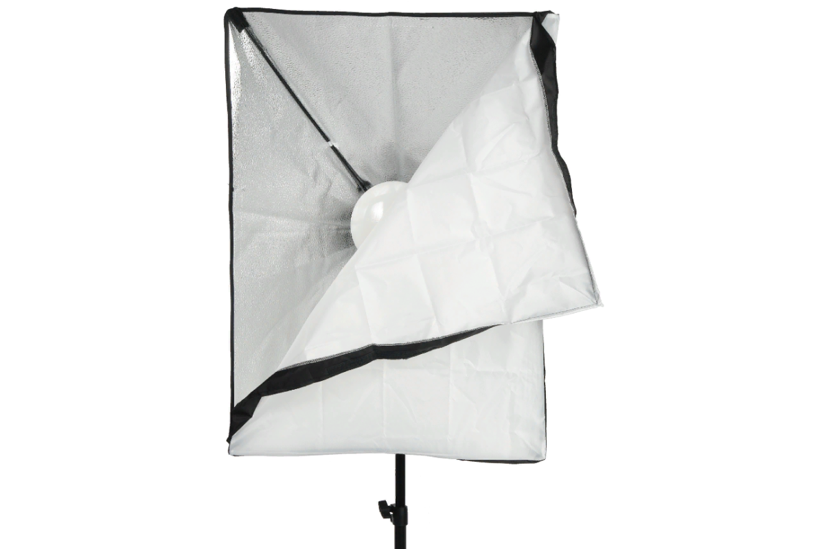 Прямоугольный несъемный cофтбокс размером 50х50 см и глубиной 30 см прикреплен к корпусу осветителя и раскрывается по принципу зонта – достаточно потянуть кольцо вверх. Купол софтбокса изготавливается из специальной синтетической ткани с серебристой светоотражающей внутренней поверхностью, используемый как рефлектор. В комплект софтбокса входит внешний тканевый рассеиватель, который одевается на передний край софтбокса и приклеивается на липучку. Софтбокс быстро собирается, разбирается и упаковывается в чехол.