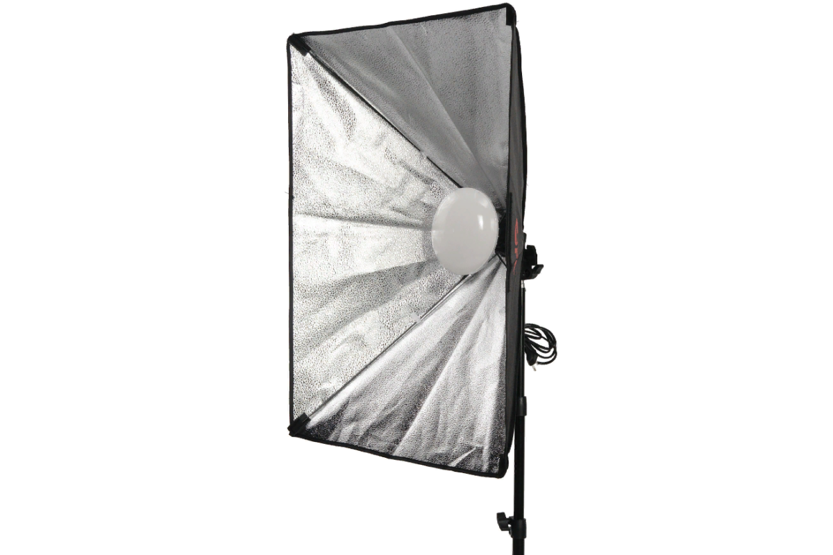 Студийный осветитель LH-E27х1 со светодиодной лампой ML-45 LED выдает световой поток линейного спектра с мощностью 45 Вт, цветовой температурой 5500 К и цветопередачей CRI>90. Матовая пластиковая колба-рефлектор лампы (диаметром 15 см) рассеивает световой поток, обеспечивая равномерное заполнение софтбокса светом. Поэтому допустимо использование софтбокса без тканевого рассеивателя.