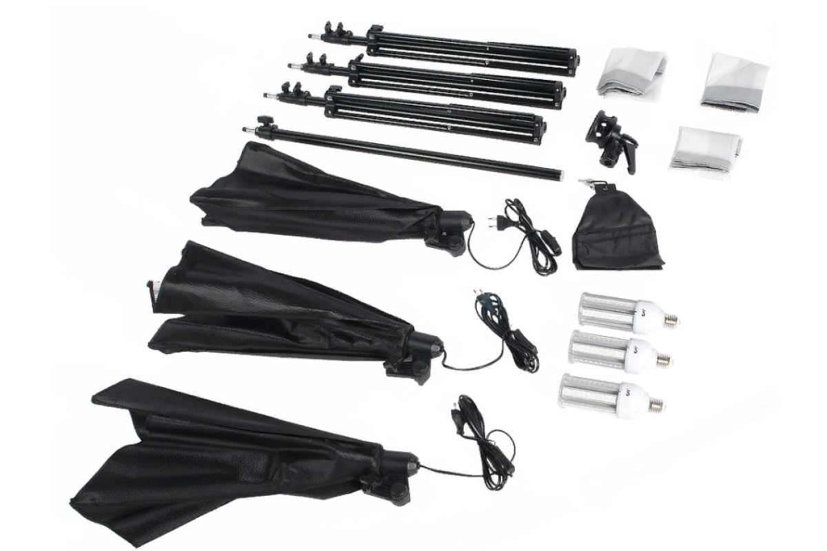 чехол, светодиодные лампы, стойки, перекладина, мешок для песка, светорассеиватель, софтбоксы, сумка