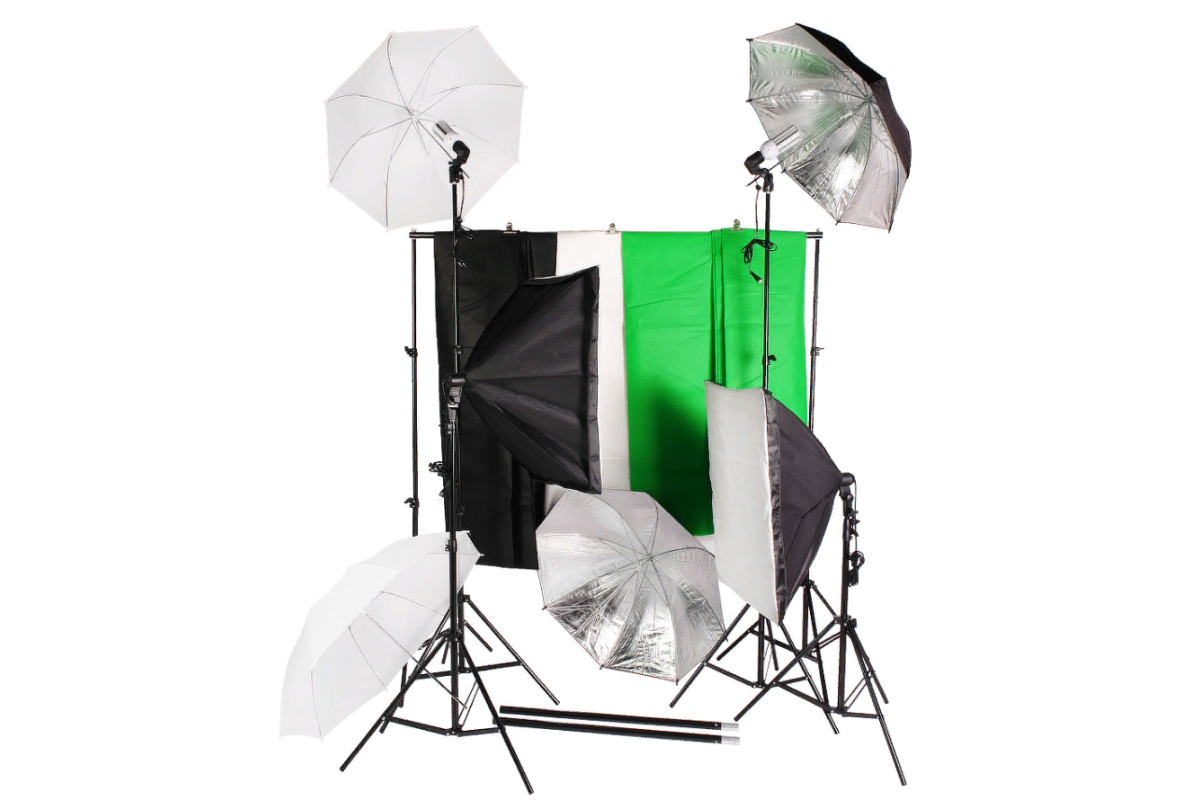 С этим комплектом возможно создание и виртуальной студии с использованием технологии «хромакей»: два источника рассеянного света равномерно подсветят экран, состоящий из двух стоек с перекладиной и натянутого комплектного фона. А два других источника света с фотозонтами отделят ведущего или актера от фона при помощи направленного на него (заливающего) светового потока.