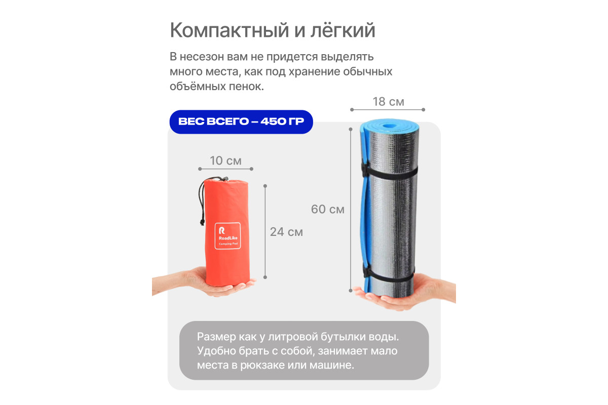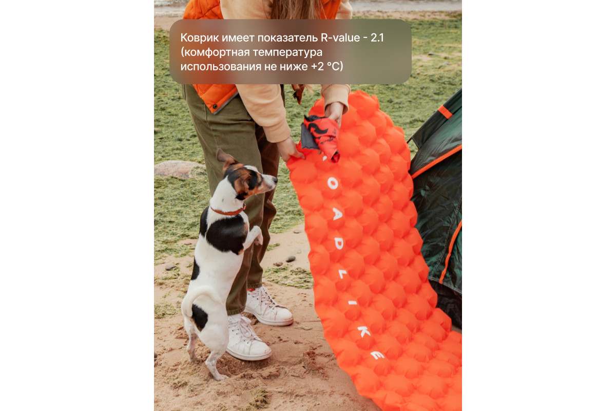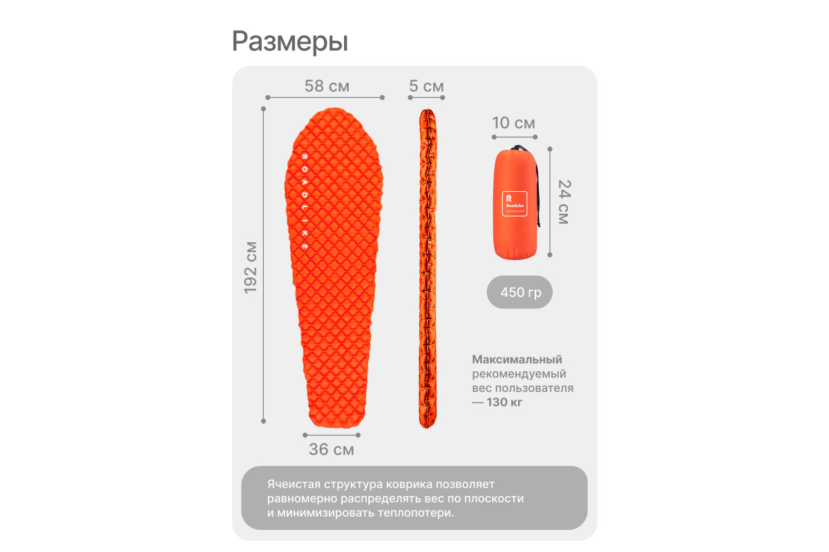 Сверхлегкий туристический коврик от RoadLike Camping в компактном чехле. Выполнен из высокопрочного и износостойкого материал Нейлон 40, водонепроницаемый и отлично выдерживает суровые условия. Инновационные технологии позволили создать сверхлегкий и компактный коврик, который станет незаменимым спутником любого путешествия. Подходит для активного отдыха на открытом воздухе, кемпинга, прогулок, туризма, рыбалки, отдыха, альпинизма, путешествий, ночевок и многого другого. Вес: 500 гр Размер: 192х58 см. Размер в чехле: 28х5х5 см. Ячеистая структура сохраняет и равномерно распределяет тепло, а также обеспечивает оптимальную поддержку во время сна. Двойной клапан обеспечивает быстрое надувание - хватит всего 10-15 вдохов, насос не потребуется. RoadLike. Возьми комфорт в дорогу.